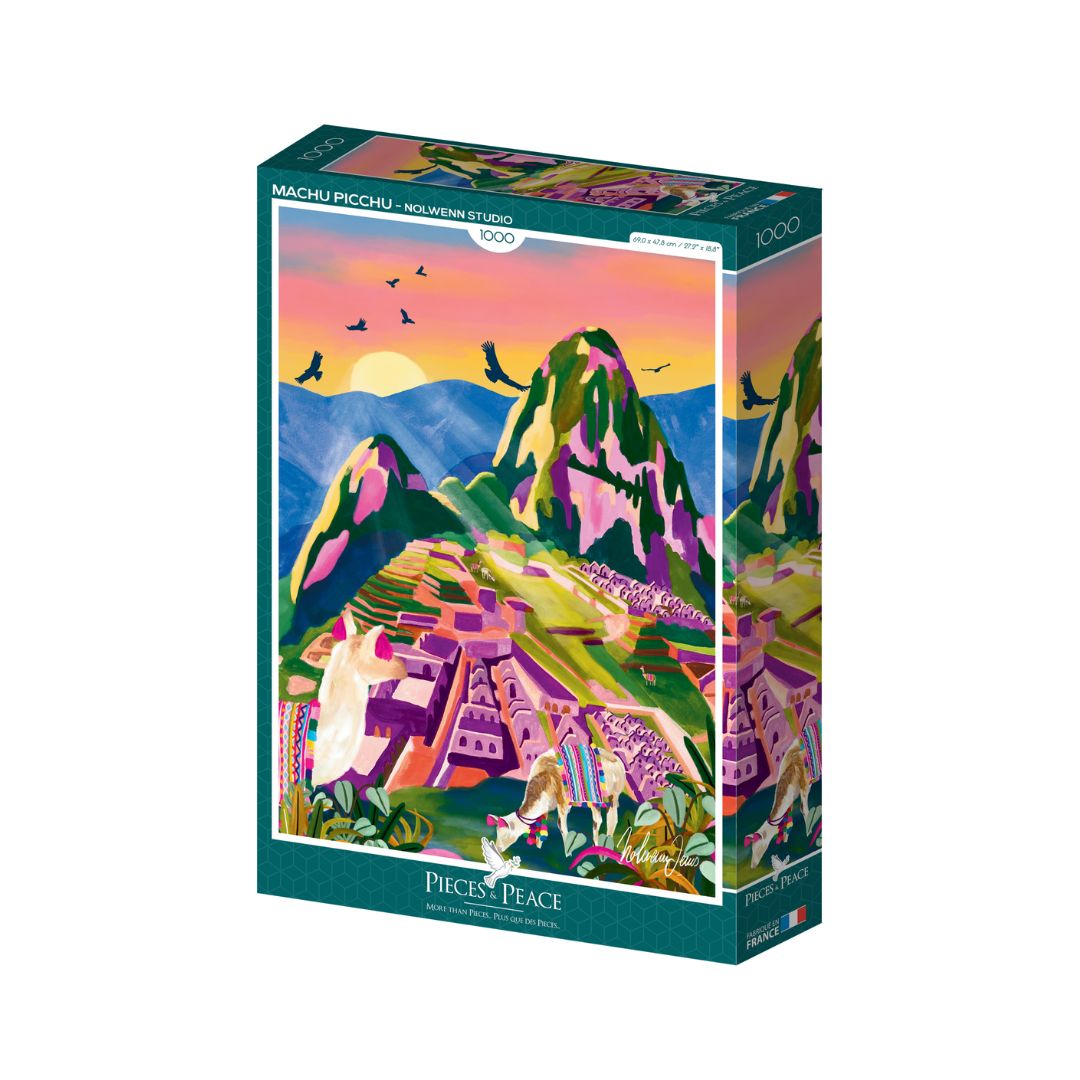Mit dem 1000-teiligen Puzzle 'Machu Picchu' entdeckst du eines der beeindruckendsten Weltwunder in einer kunstvollen und farbenfrohen Darstellung. Die Illustration von Nolwenn Studio fängt die Magie und die majestätische Schönheit dieser historischen Stätte in den peruanischen Anden ein. Tauche ein in die faszinierende Welt der Inka und erlebe, wie diese atemberaubende Szenerie Stück für Stück entsteht.