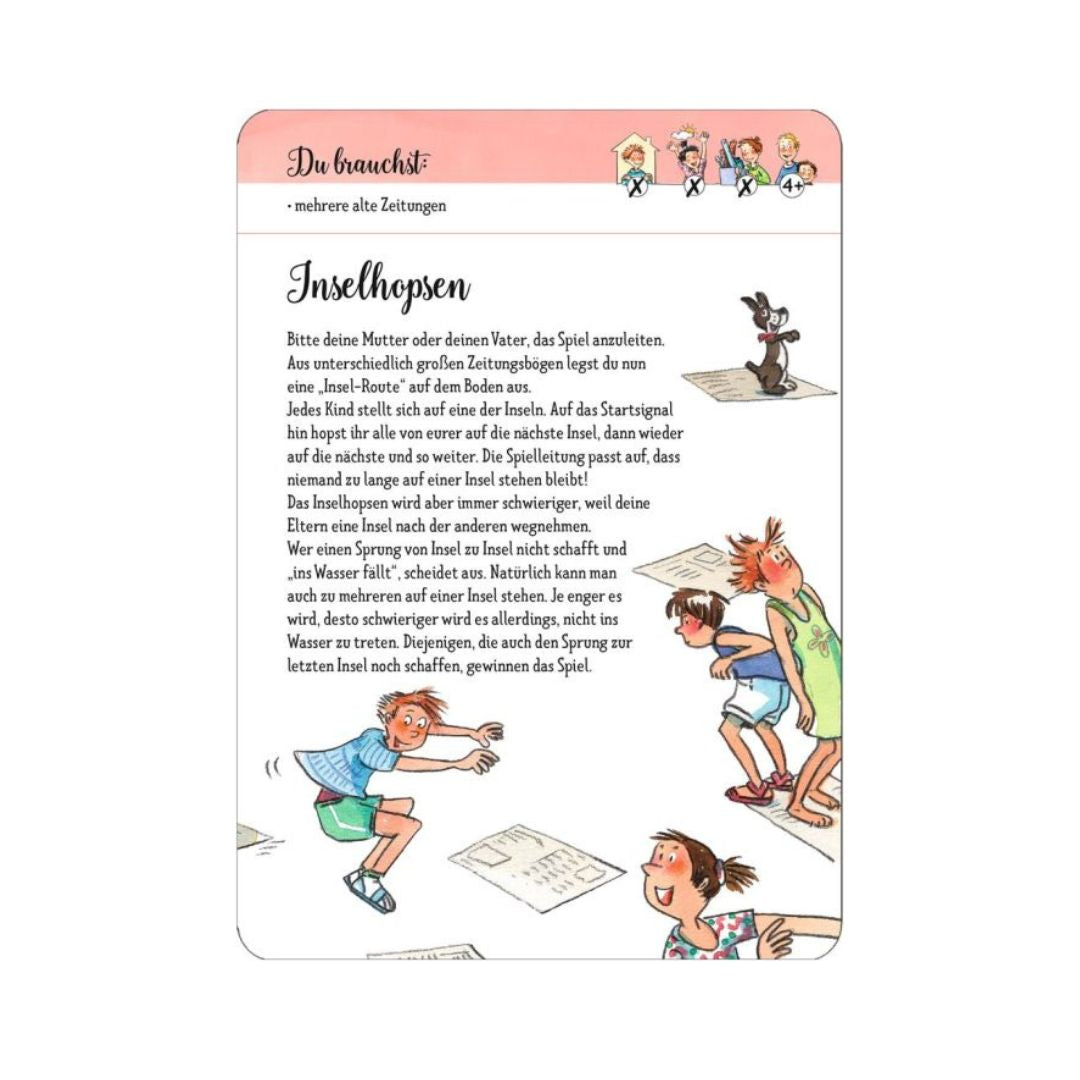 Manchmal hat man viel Zeit für die Vorbereitung, manchmal geht alles schnell und spontan – in beiden Fällen bieten diese Spielekarten die ideale Lösung. Du findest sowohl Spiele, die ohne Vorbereitung auskommen, als auch solche, die mit ein wenig Planung noch mehr Spaß machen. Dank der übersichtlichen drinnen/draußen-Empfehlungen kannst du sofort entscheiden, welches Spiel am besten zur aktuellen Situation passt.