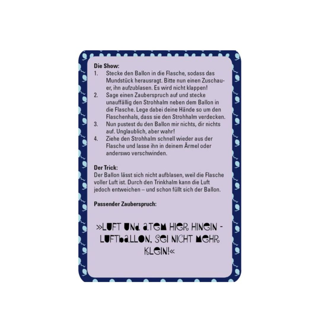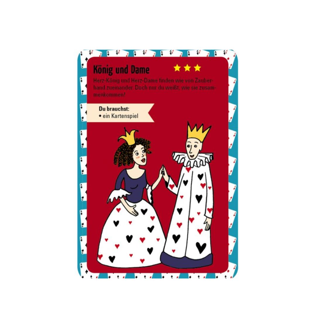 Die 50 Ideen sind auf handlichen Karten zusammengefasst, die in einer praktischen Schachtel geliefert werden. Diese Schachtel kannst du ganz einfach in deinem Rucksack, deiner Reisetasche oder sogar in der Handtasche verstauen. Egal, ob du unterwegs bist, zu Hause oder sogar in der Schule – mit diesen Zaubertricks bist du immer bereit, ein wenig Magie in den Alltag zu bringen. Ob im Auto, im Flugzeug oder im Wartezimmer – die Möglichkeiten sind grenzenlos!