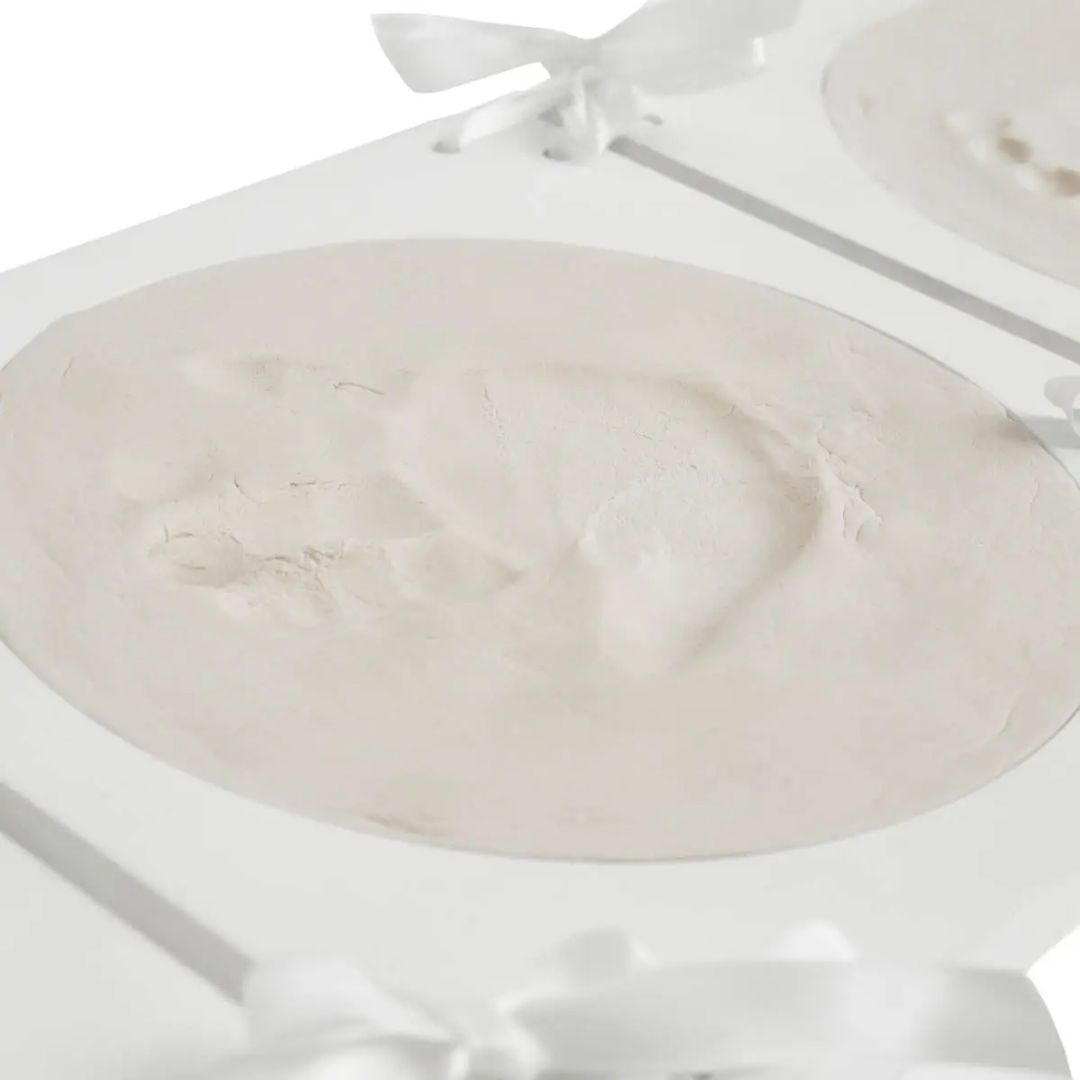 Das My Memory Kit enthält alles, was du benötigst, um einen wunderschönen und langlebigen Abdruck zu gestalten. Der runde Bilderrahmen bietet drei Fenster, die du individuell gestalten kannst. Zwei Fenster sind für die Abdrücke vorgesehen, und ein zusätzliches Fenster bietet Platz für ein Foto deines Babys oder der Familie. Die Modelliermasse ist perfekt auf die Größe des Rahmens abgestimmt, sodass du ohne zusätzliche Materialien direkt starten kannst.
