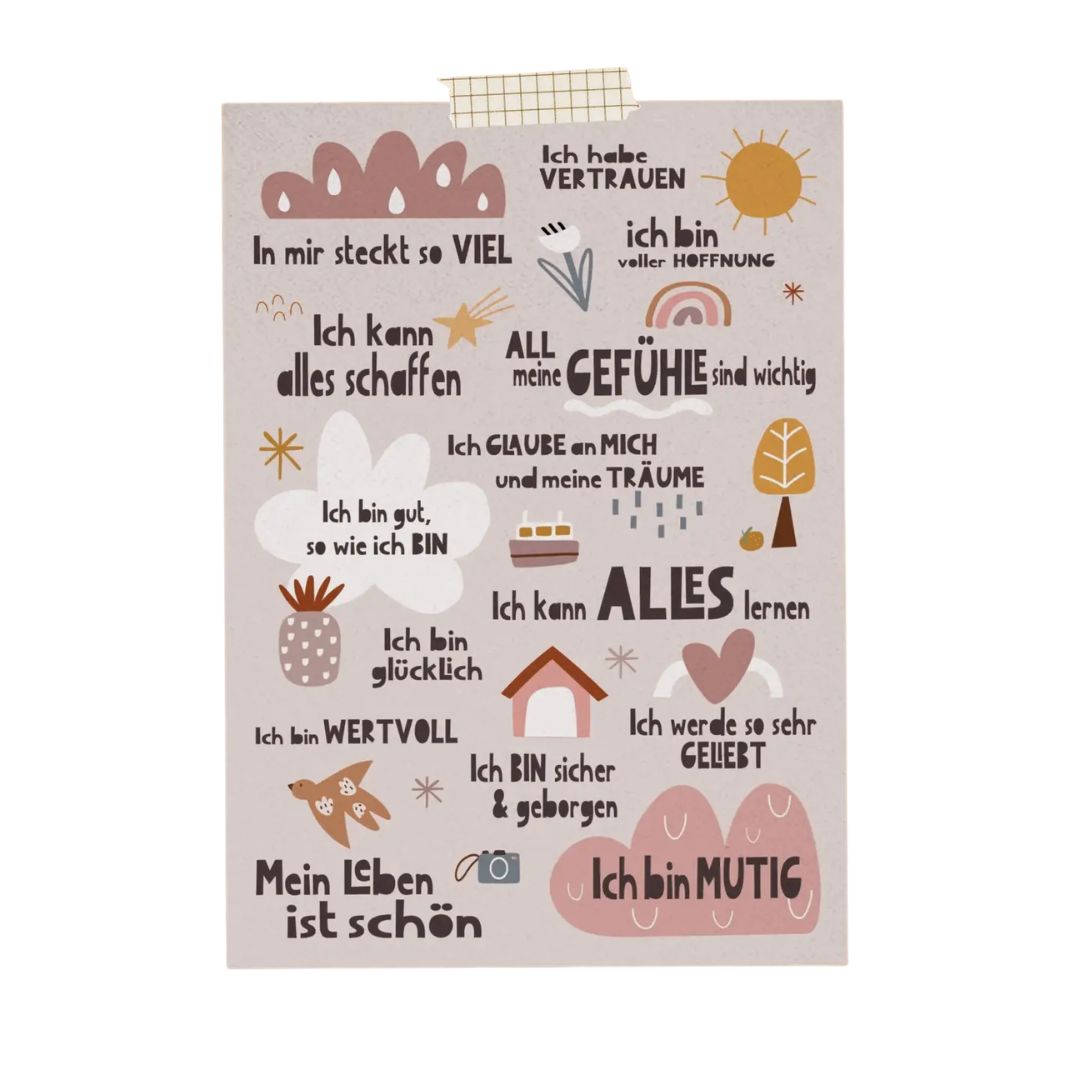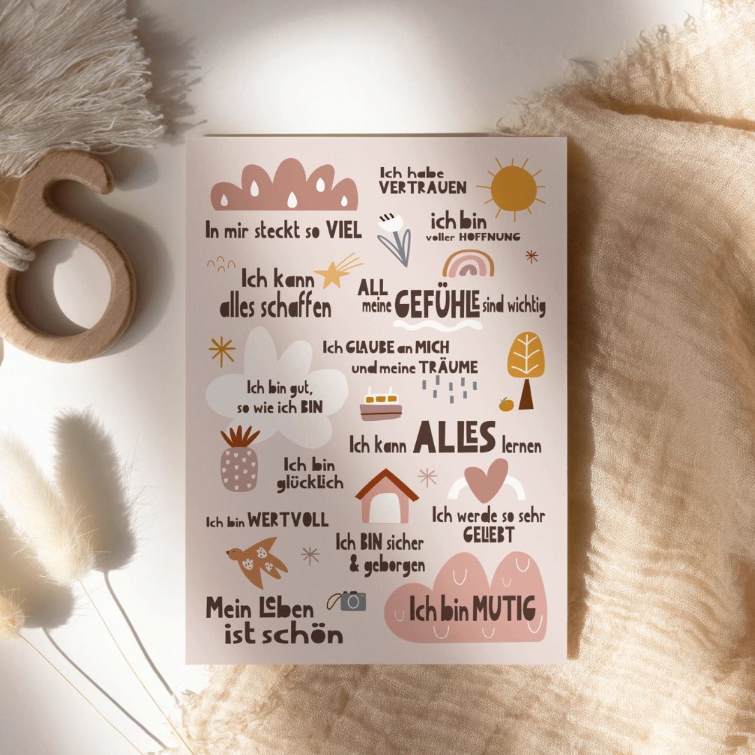 Affirmationskarte mit wertvollen Botschaften im DIN A6 Format, gedruckt auf mattem 300 g/m² Naturpapier. Super leicht zu beschriften und ideal als Geschenkbeigabe oder einfach mal für zwischendurch. Die Rückseite ist bis auf ein kleines Logo blanko.