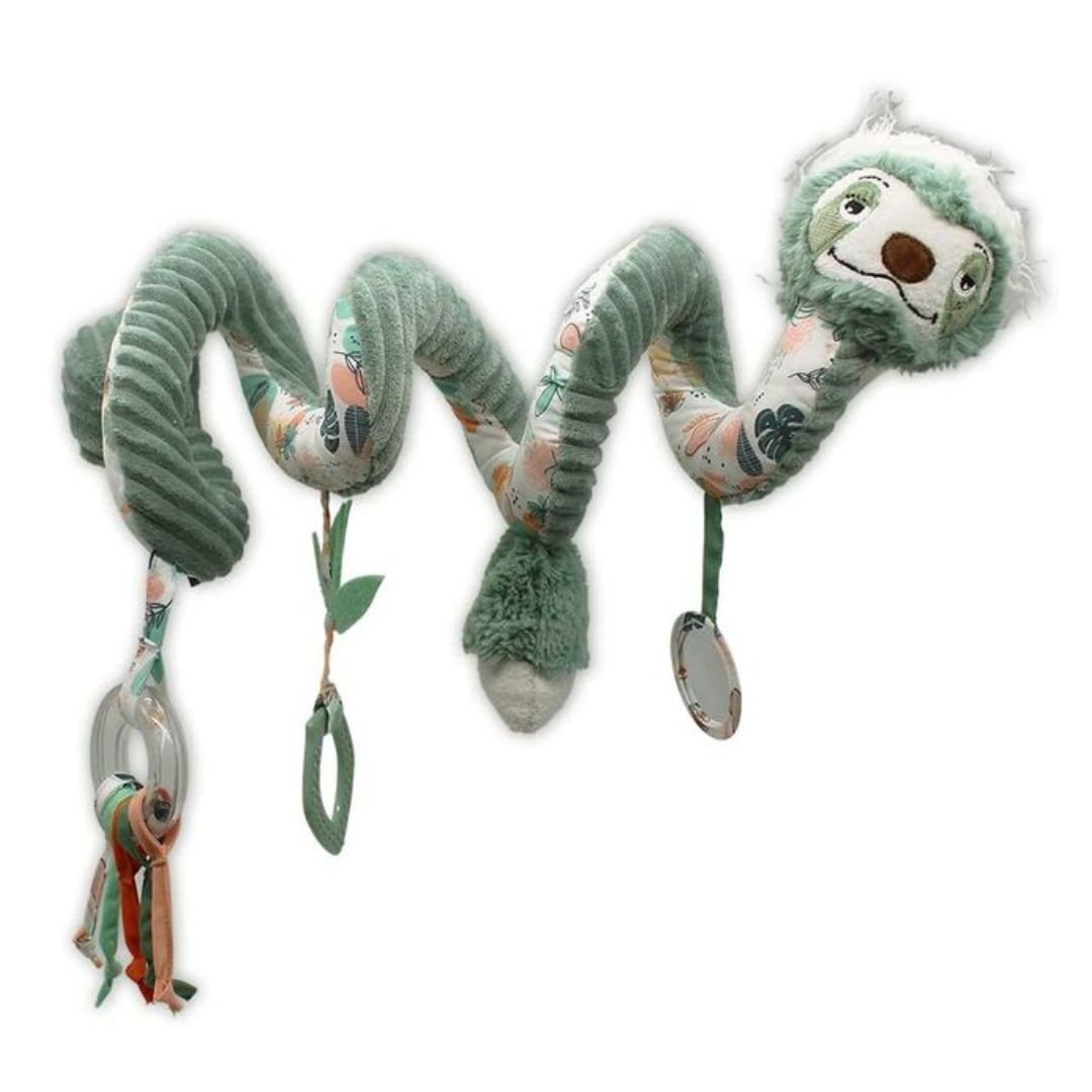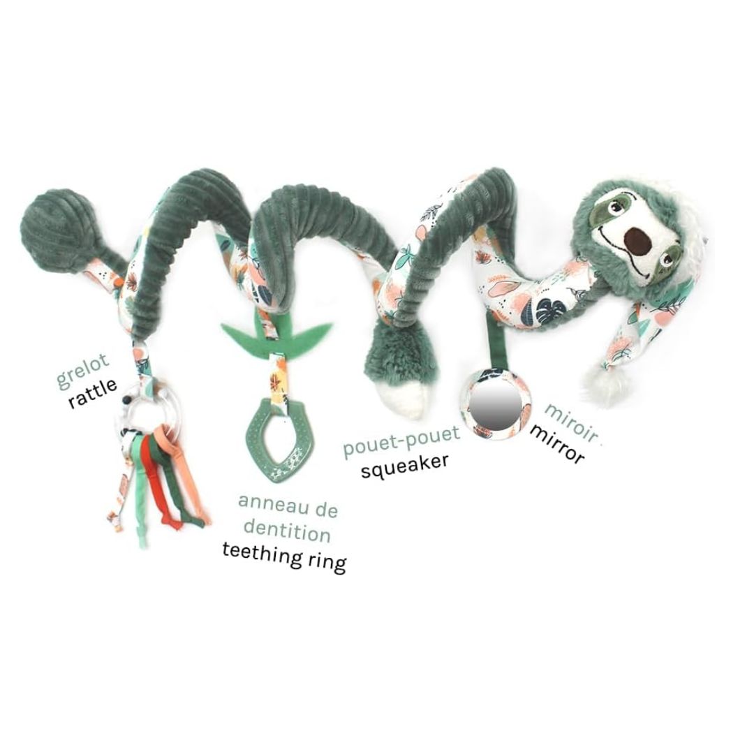 Ein witziges Spiral Spielzeug mit vielen Geräusch- und Tastaktivitäten: Rassel, Knisterpapier, Quietscher, Spiegel, Beißring.