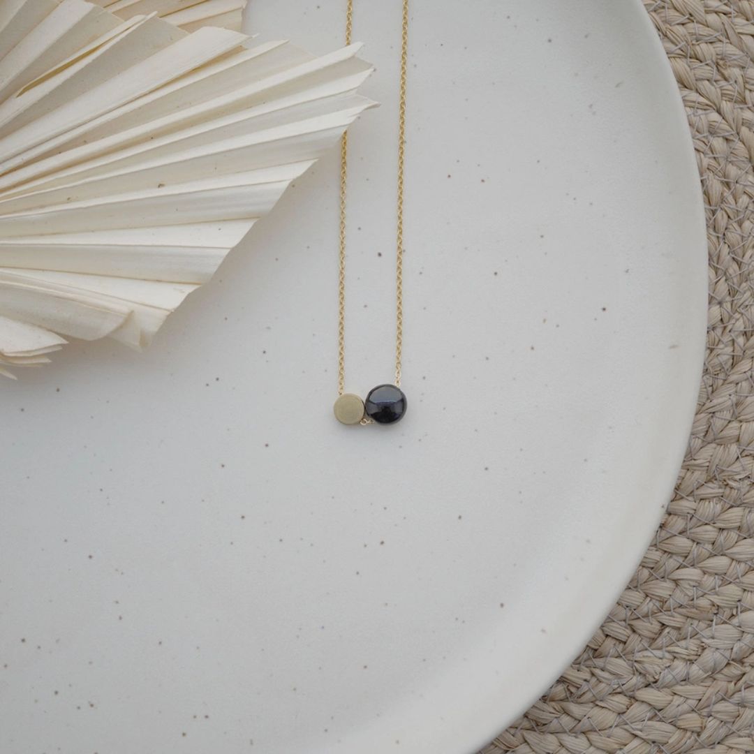 Eine feine, schwarz glasierte Porzellanperle schmückt diese vergoldete Kette & macht sie zu einem tollen Allrounder. - Anhänger Messing - Kette: Messing 14k vergoldet , 45cm lang