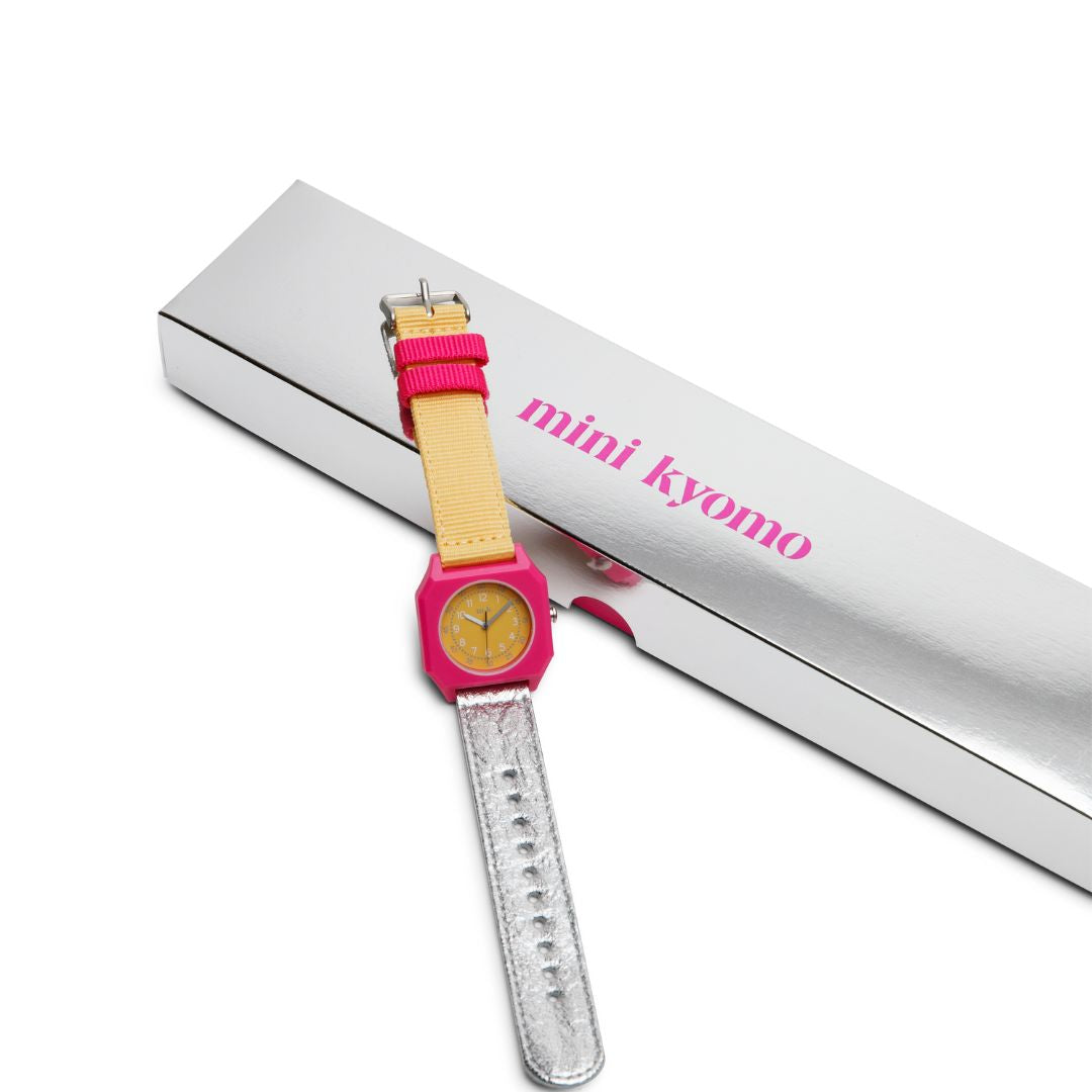 Unisex-Kinderuhr Made in Italy mit Gehäuse aus recyceltem Nylon und PU+Nylonarmbändern aus recyceltem Silber. Es ist das perfekte Weihnachts- und Geburtstagsgeschenk!