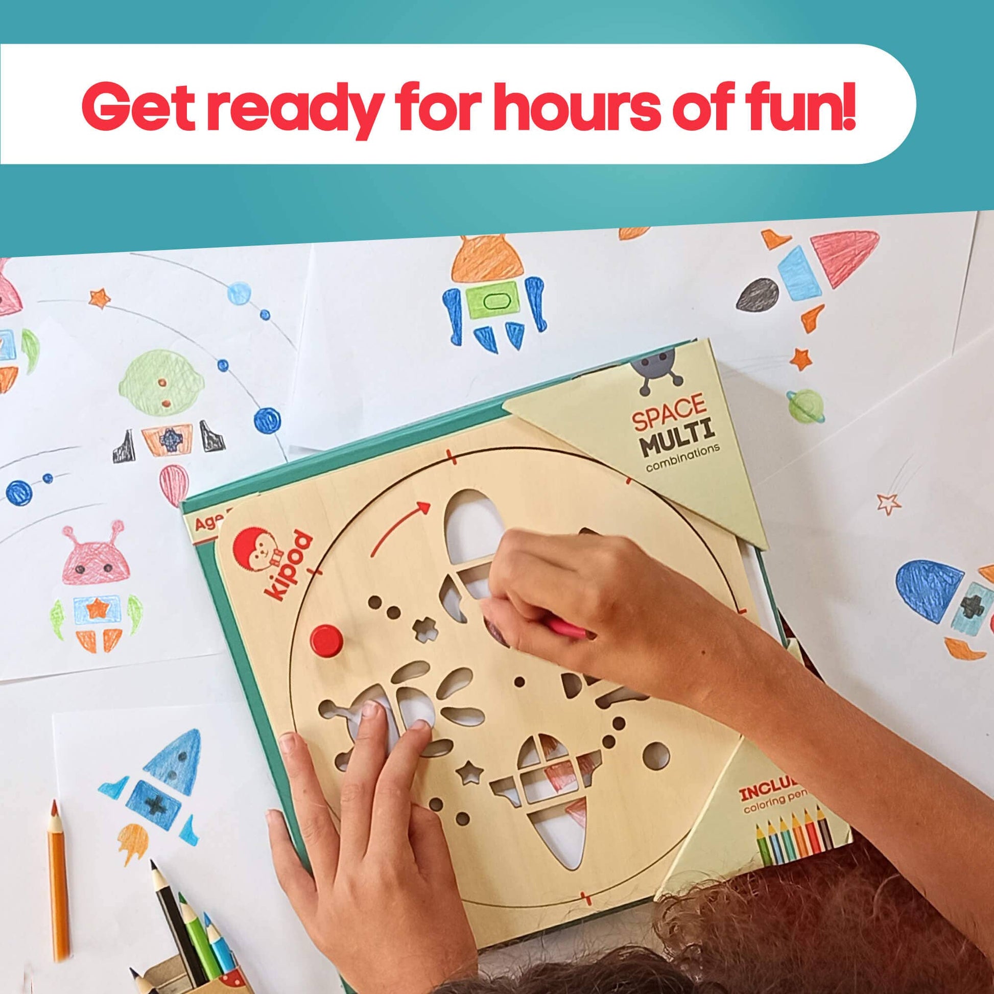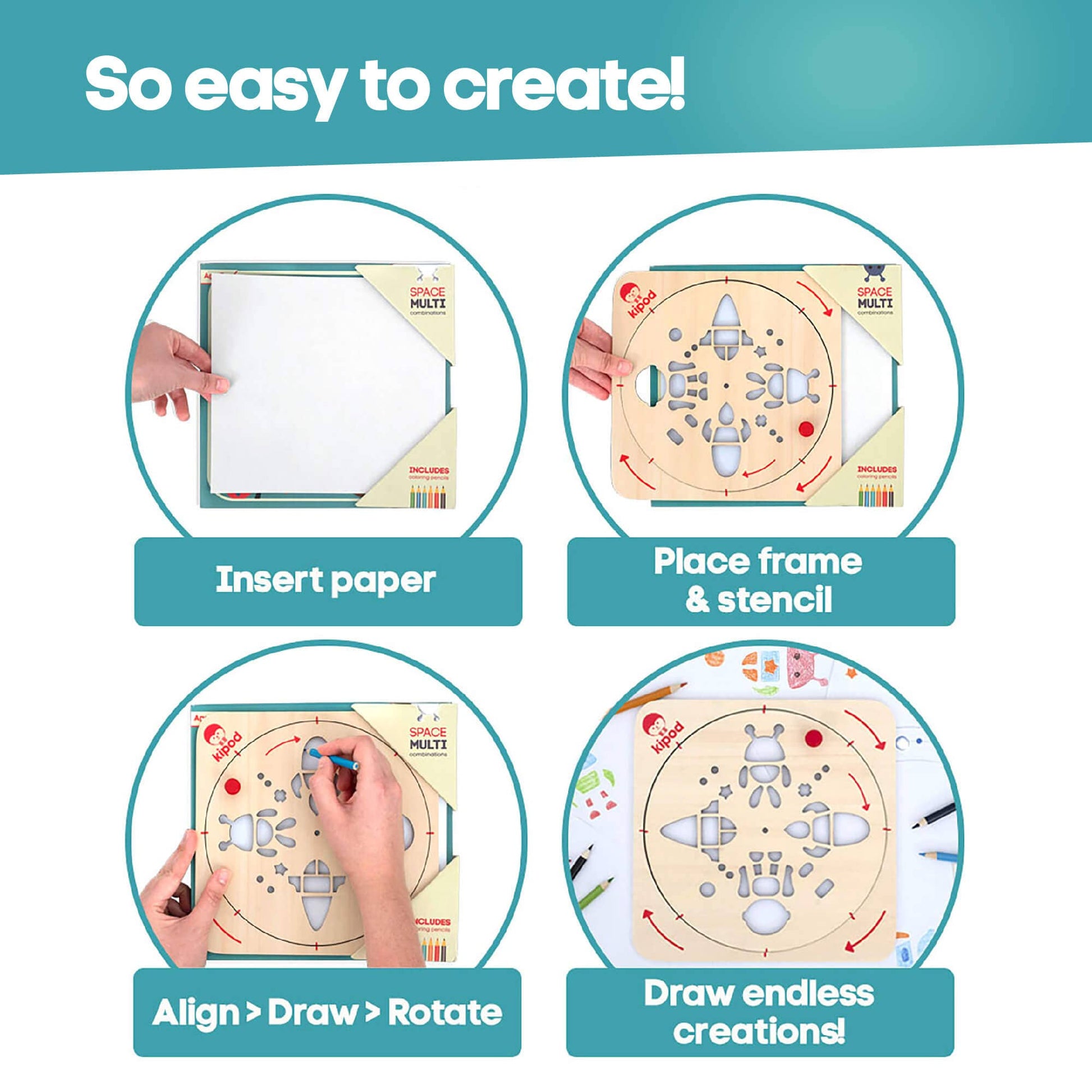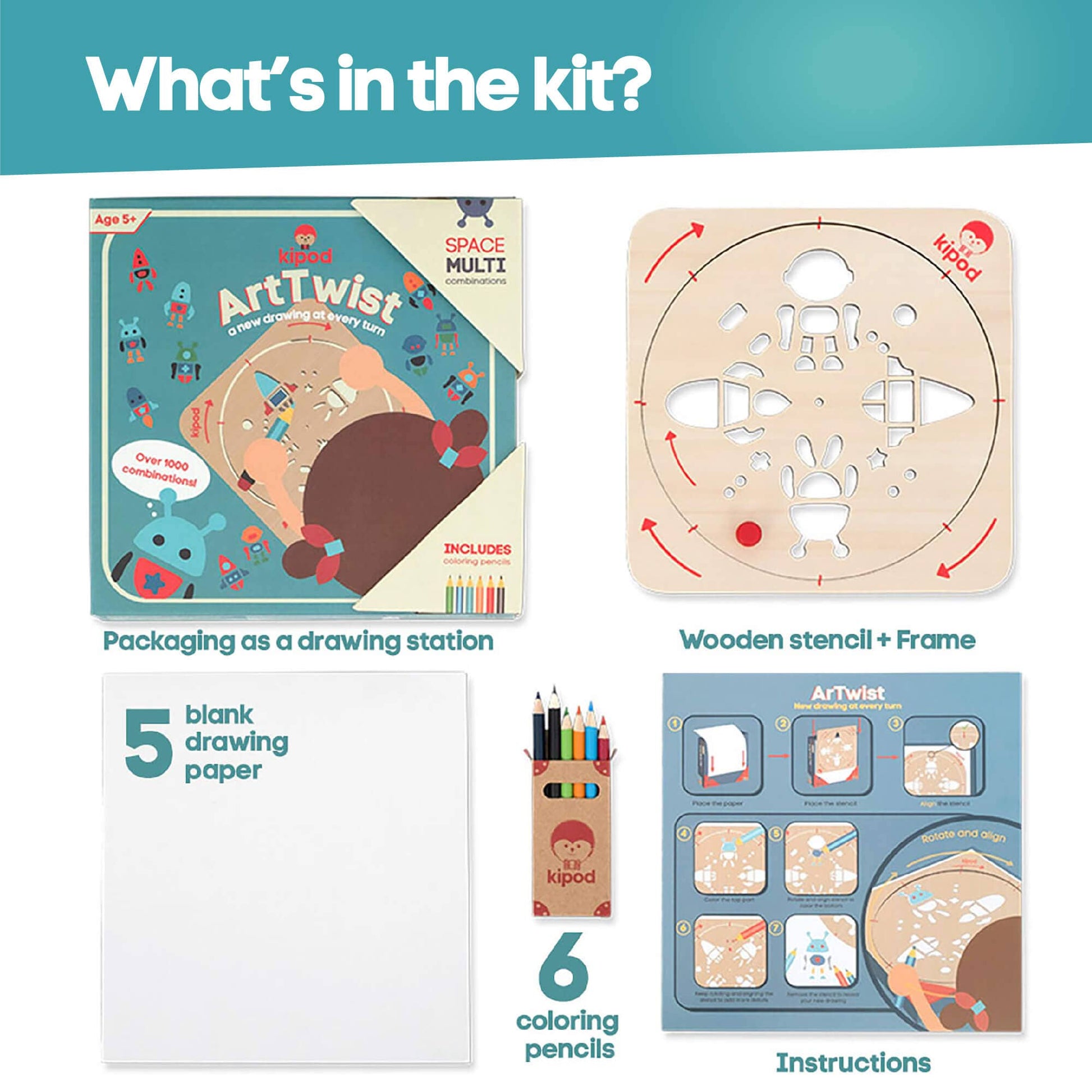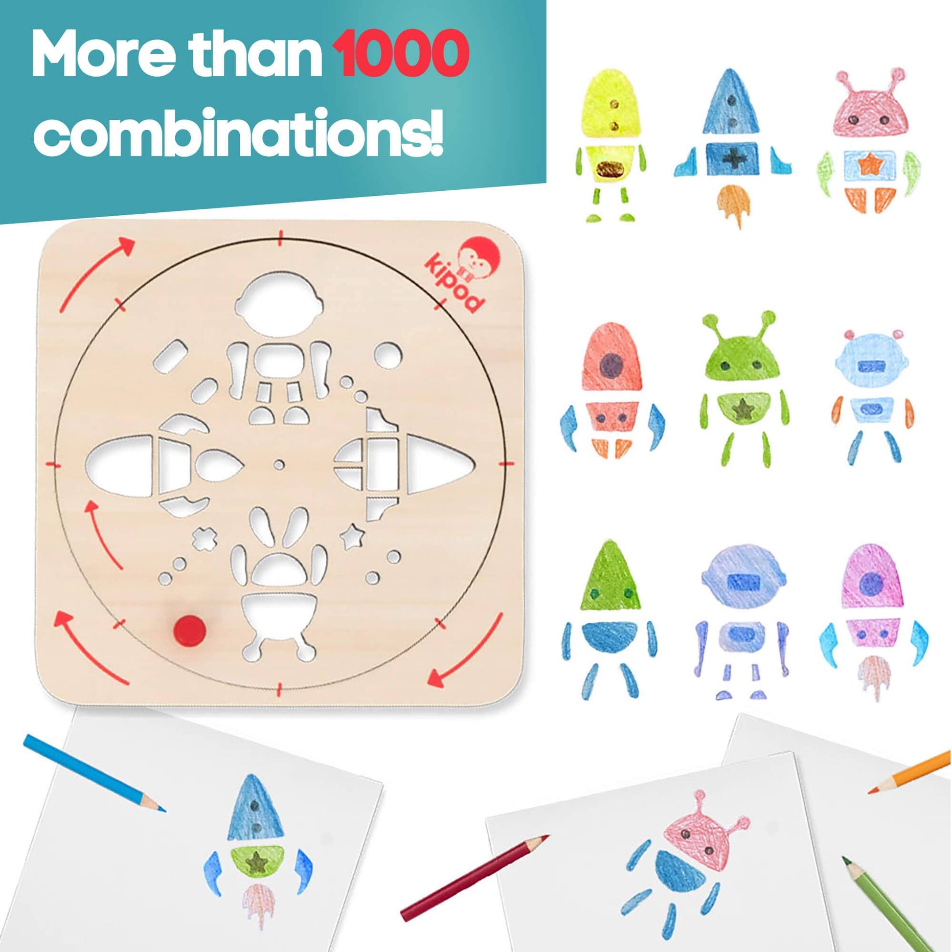 Kreiere mit unserem rotierenden Schablonenset über 1000 Kombinationen zum Zeichnen von Tieren! Unser spezielles Holzschablonen-Set kommt mit einem Rahmen, 6 Buntstiften und 5 Blättern Papier, um Ihrem Kind Raum für Kreativität und Fantasie zu bieten. Mit ArtWist wird das Kunstset Deines Kindes vereinfacht, ohne dabei die Bildmöglichkeiten einzuschränken. Durch eine einfache drehbare Schablone können Kinder jedes Mal einzigartige Bilder erstellen!