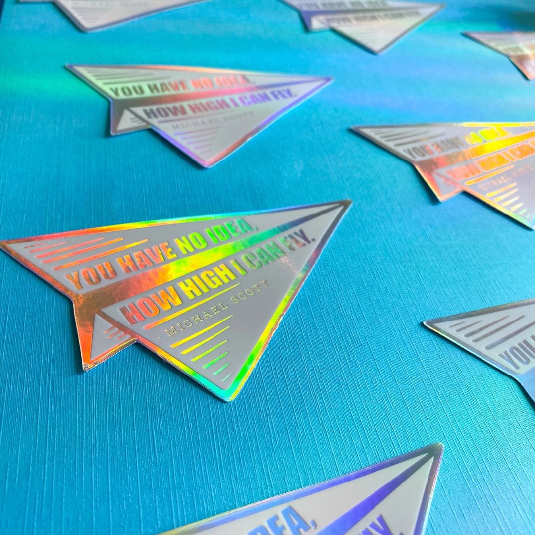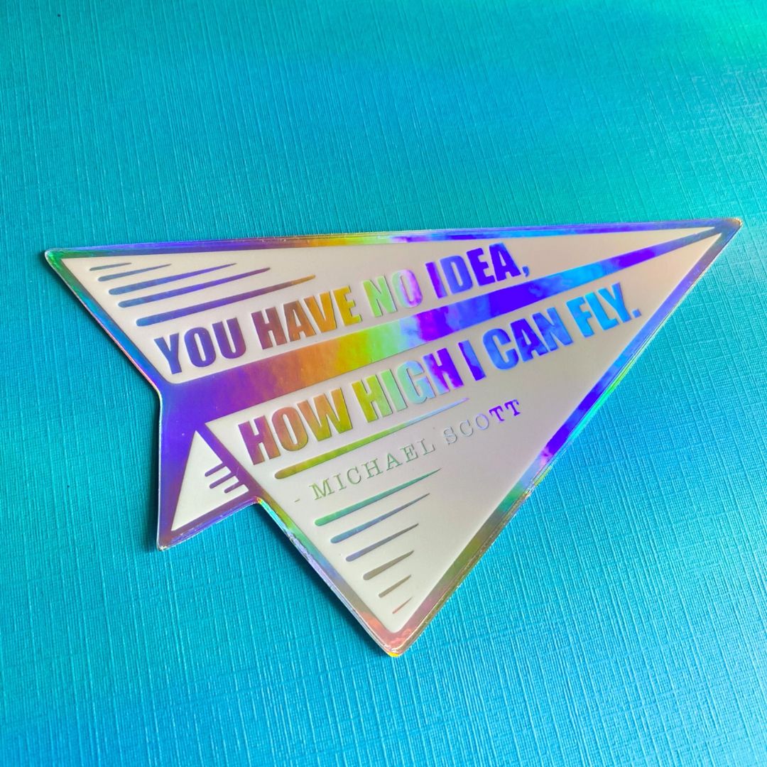 • Wenn du ein Fan der Show The Office bist und alle Zitate von Michael Scott liebst wirst du diesen holografischen Aufkleber „Du hast keine Ahnung, wie hoch ich fliegen kann“ lieben
