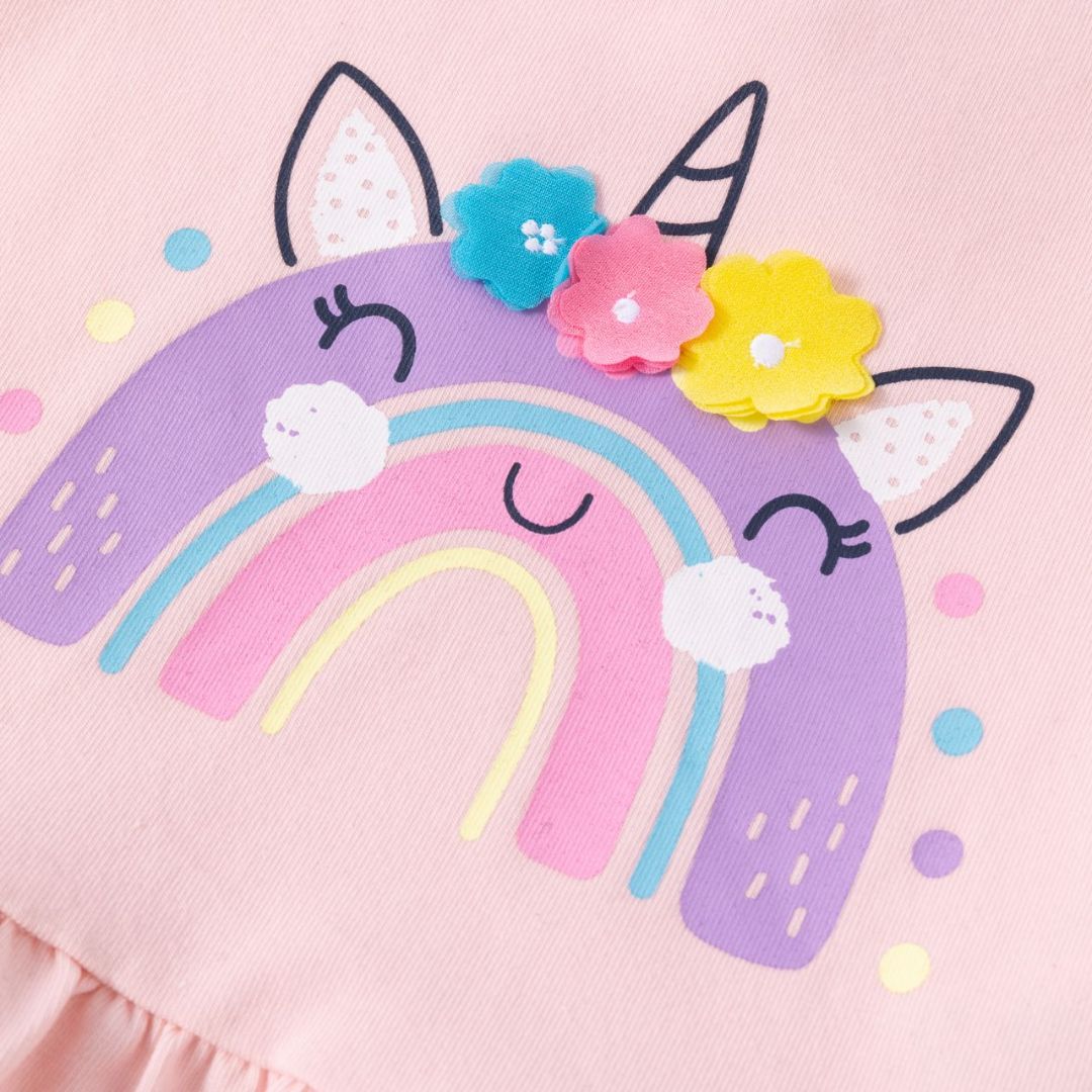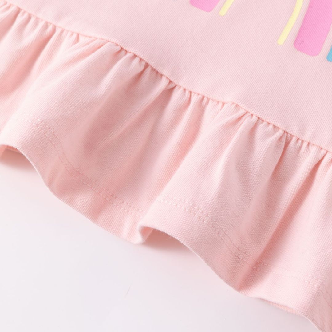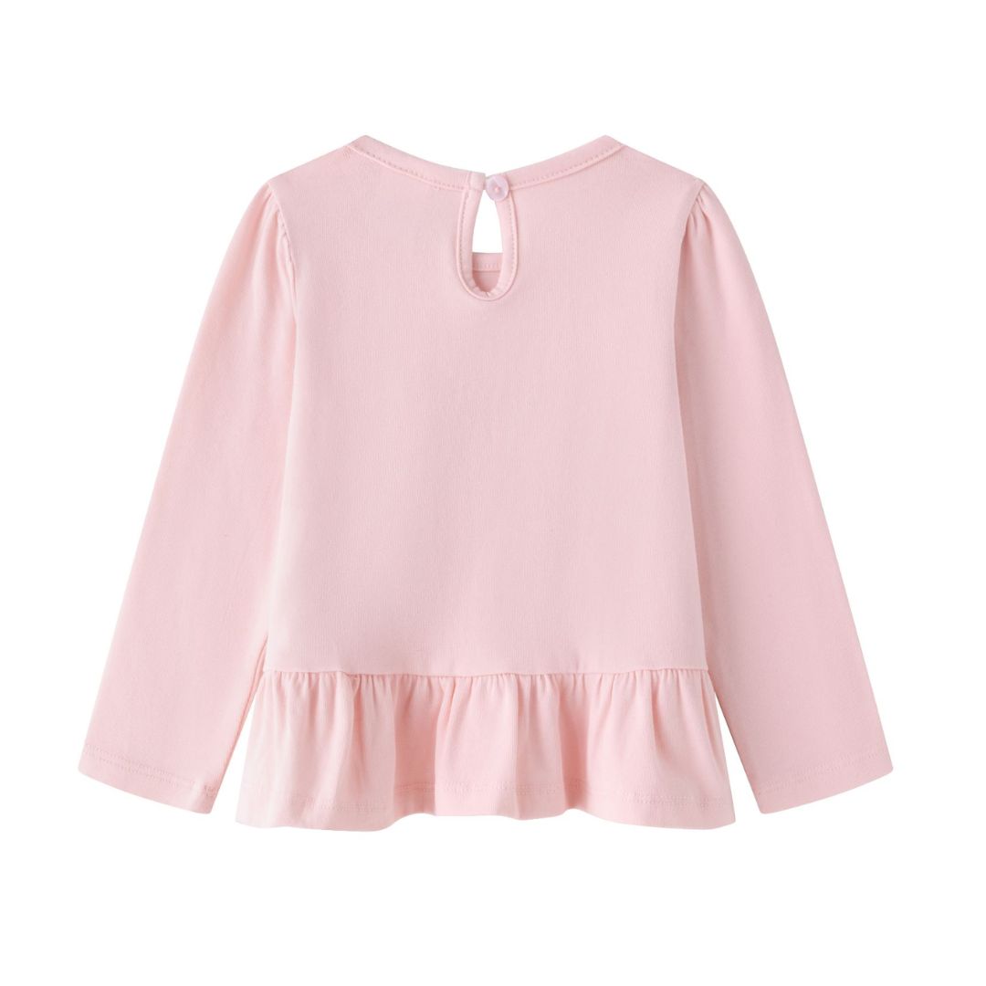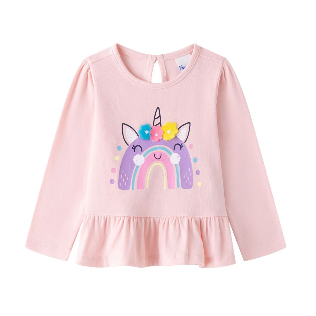 Langärmliges Baby-T-Shirt für Mädchen. Mit Raffung an der Schulter und doppeltem Volant am Saum. Wasseraufgedrucktes Regenbogendesign mit Glitzer- und Reliefdetails. Öffnung mit Knopf am Rücken.