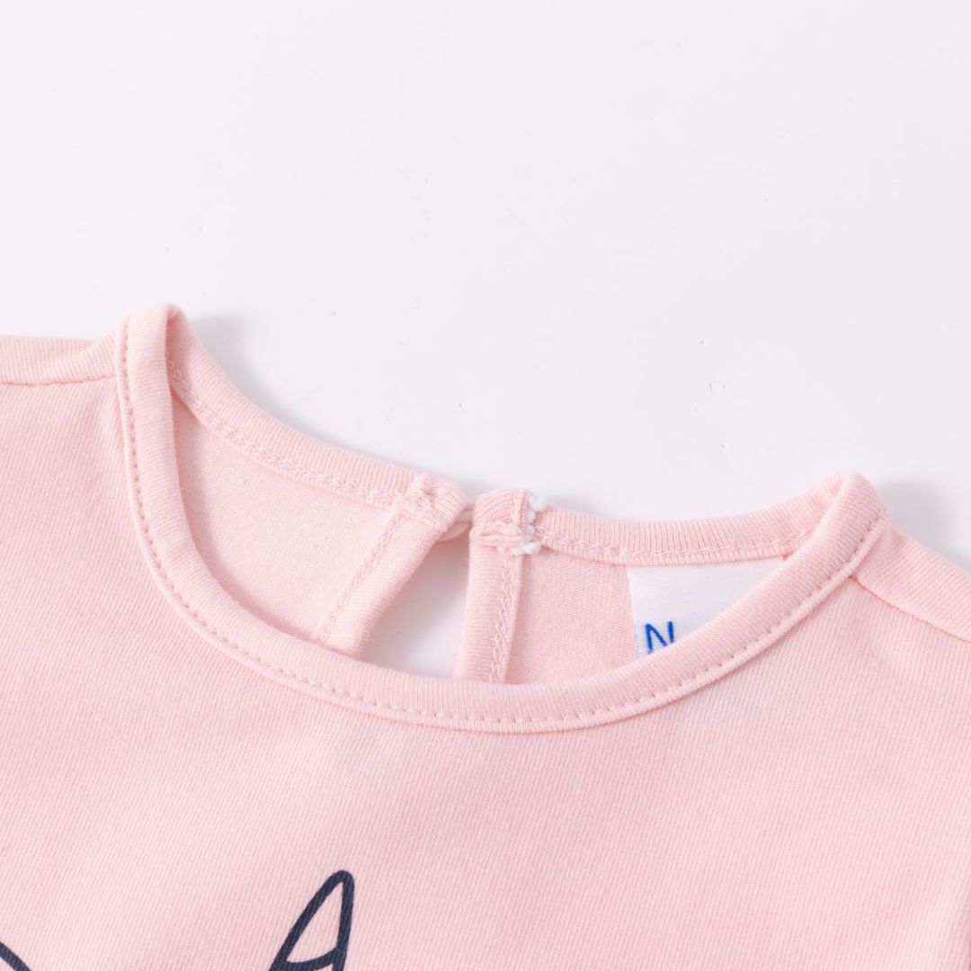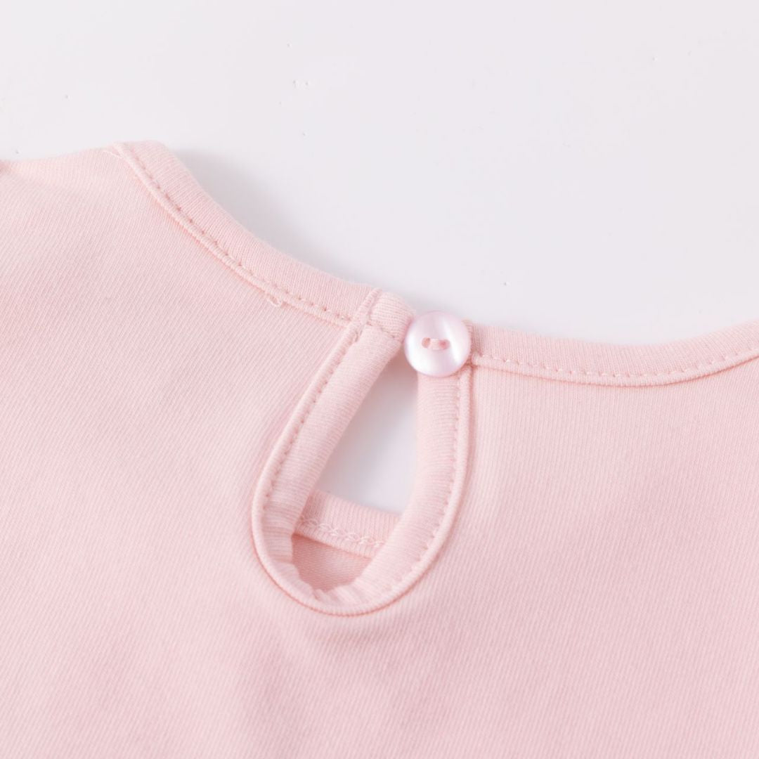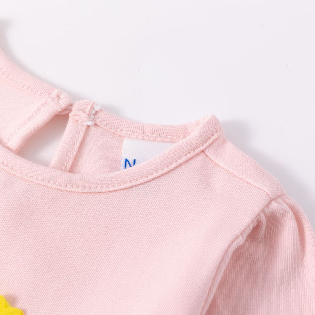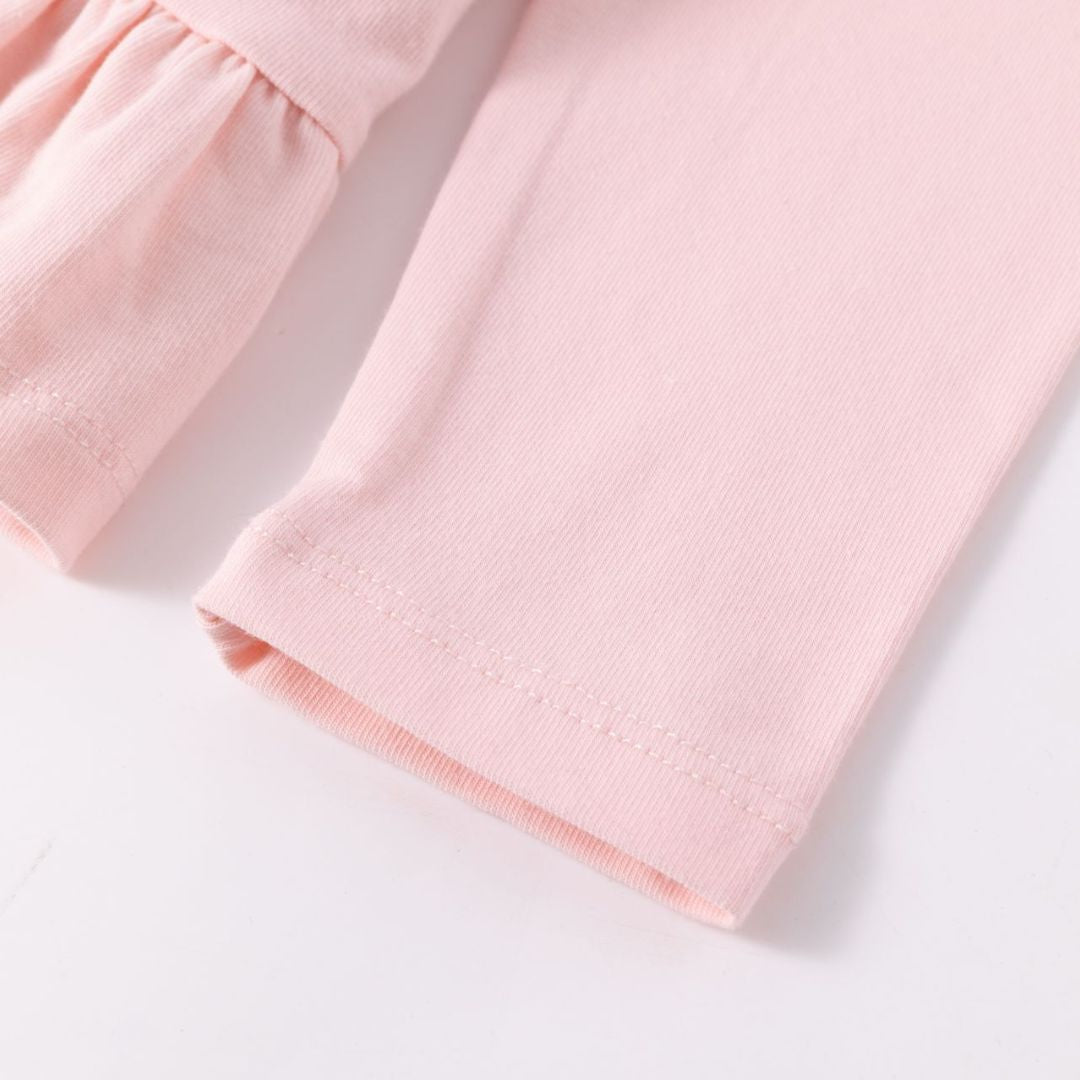 Langärmliges Baby-T-Shirt für Mädchen. Mit Raffung an der Schulter und doppeltem Volant am Saum. Wasseraufgedrucktes Regenbogendesign mit Glitzer- und Reliefdetails. Öffnung mit Knopf am Rücken.