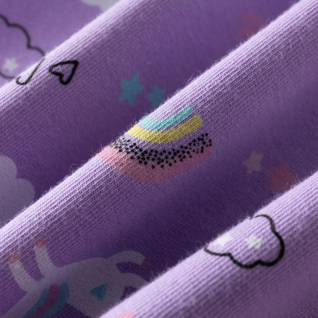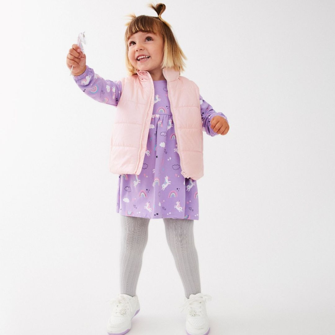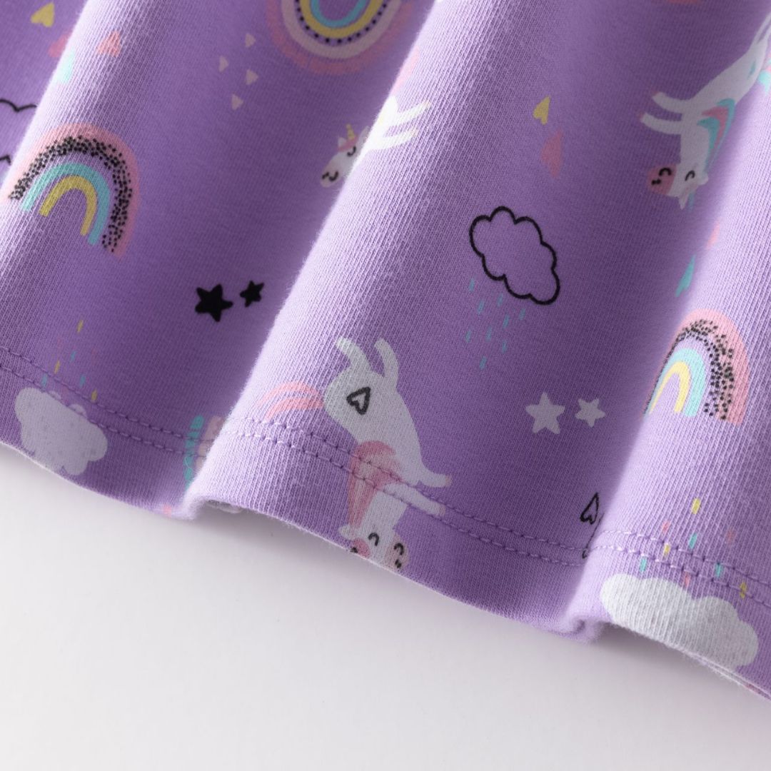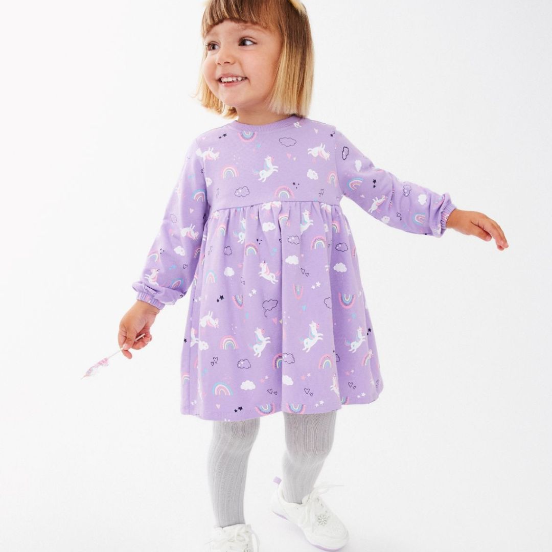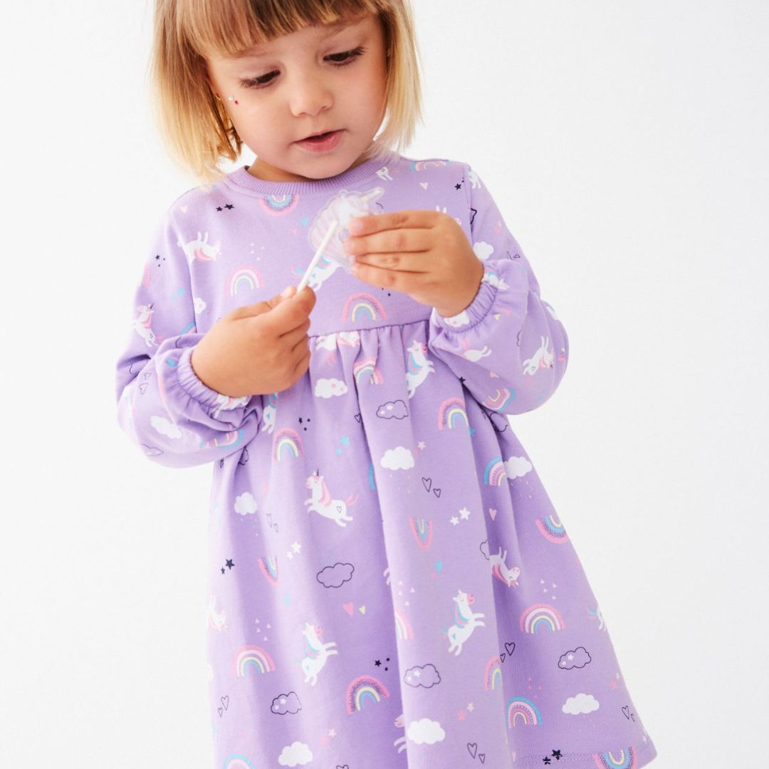 Baby Midikleid mit Einhorn-Aufdruck. Rundhalsausschnitt aus Rippstrick. Hüftschnitt mit Raffung am Rock. Gummizug im Ärmelbund.