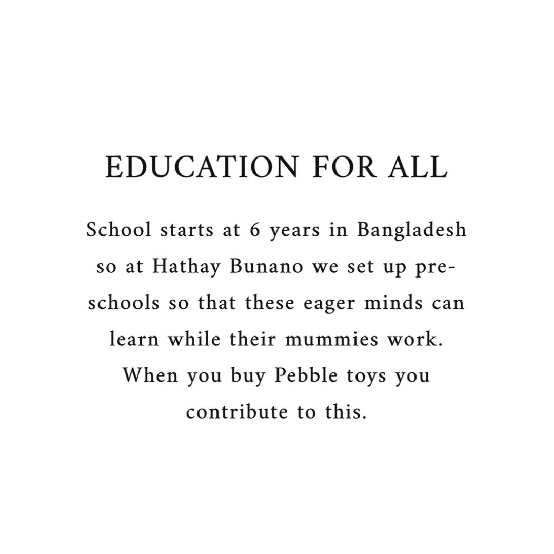 Die Libellenrassel Khaki wird von Hathay Bunano, einer gemeinnützigen Fair-Trade-Organisation in Bangladesch, gefertigt. Der Name "Hathay Bunano" bedeutet auf Bangla „handgemacht oder handgestrickt“ und spiegelt die Philosophie des Unternehmens wider: die Förderung von lokalen, handwerklichen Arbeitsplätzen für benachteiligte Frauen auf dem Land. Die Organisation stellt sicher, dass alle Produkte unter fairen Arbeitsbedingungen und zu fairen Löhnen produziert werden.