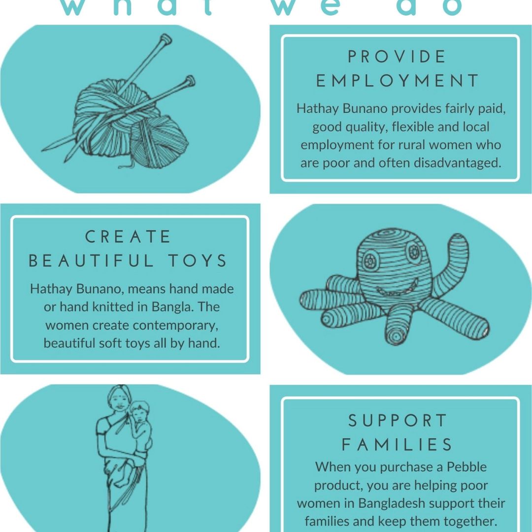 Die Möwenrassel ist ein handgemachtes Babyspielzeug, das mit Liebe und Hingabe von talentierten Handwerkerinnen in Bangladesch hergestellt wird. Hathay Bunano, was im Bangla "handgemacht" oder "handgestrickt" bedeutet, ist eine gemeinnützige Organisation, die sich dem Fair-Trade-Prinzip verschrieben hat. Ihr Ziel ist es, Frauen aus ländlichen Regionen eine stabile Einkommensquelle zu bieten, indem sie mit ihnen zusammenarbeitet und ihnen eine faire Bezahlung garantiert.
