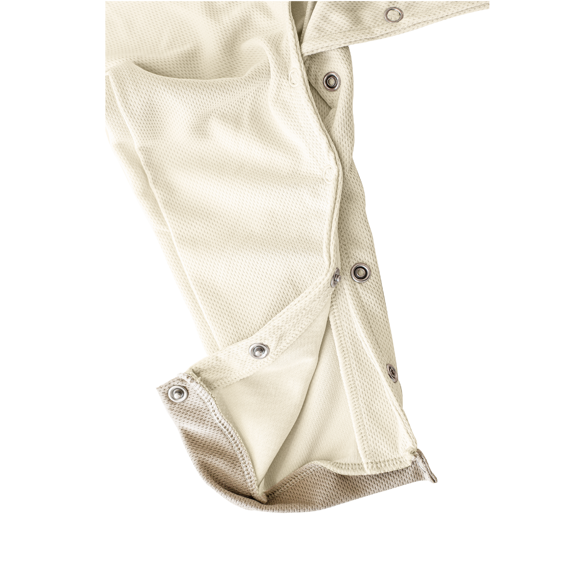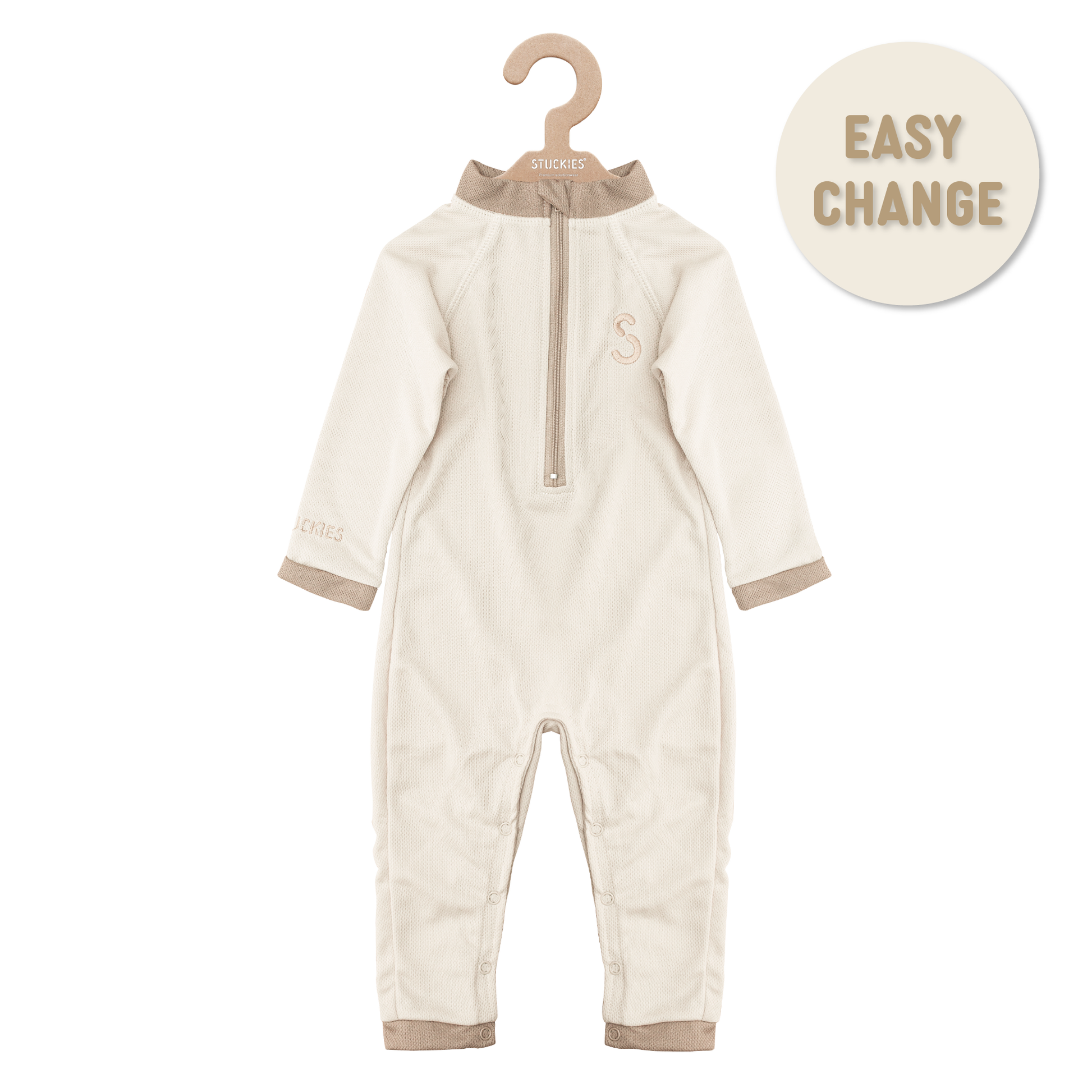 Ein einteiliger Ganzkörper-Badeanzug mit UPF 50+ Schutz und neuer Easy-Change-Technologie. Knöpfe an der Innennaht des Badeanzugs ermöglichen das Wechseln von Windeln und Toilettenpausen, ohne lästiges An- und Ausziehen kalter und nasser Badeanzüge.