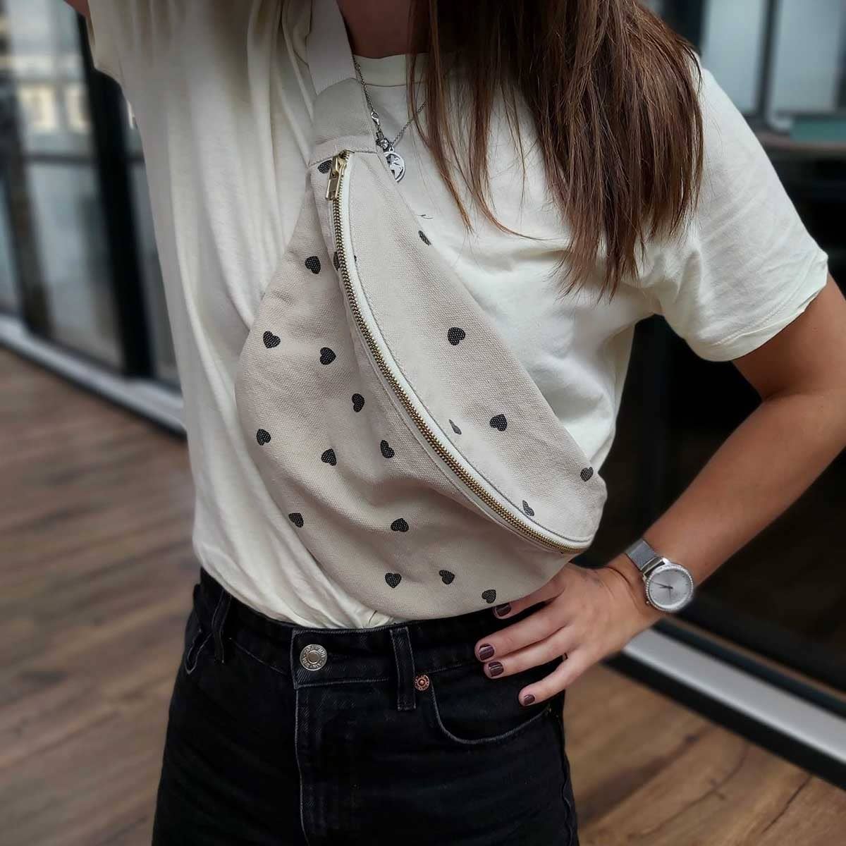 Die modische Gürteltasche für Damen mit Allover Herzprint von Rose in April ist nicht nur ein praktisches Accessoire, sondern auch ein trendiges Statement für dein Outfit. Mit ihrem einzigartigen Design, der sandfarbene Ton mit einem schwarzen Herzprintmuster kombiniert, zieht sie alle Blicke auf sich. Diese Bananentasche bietet nicht nur genügend Platz für deine Essentials, sondern verleiht deinem Look auch eine verspielte Note.