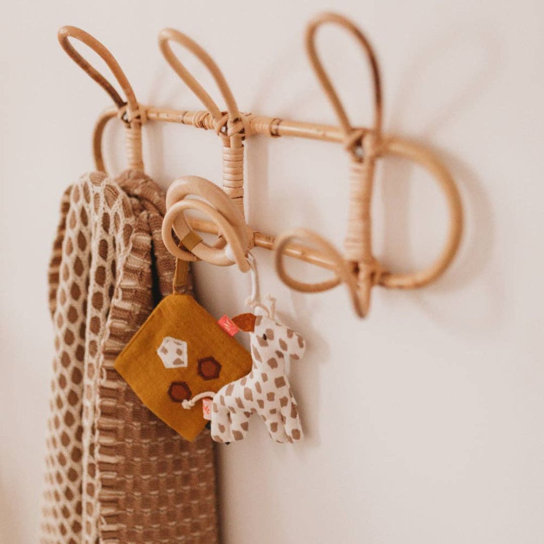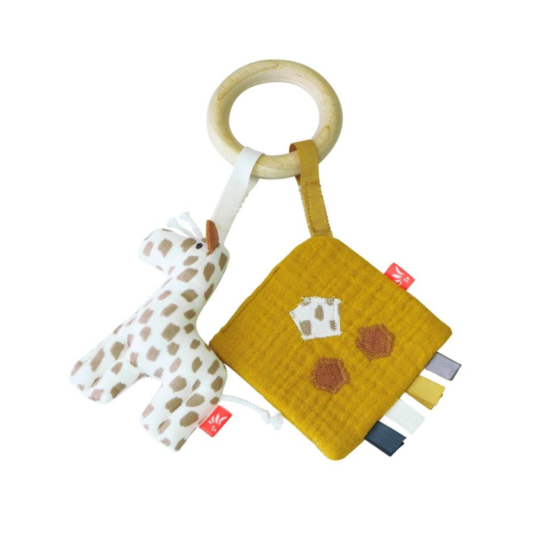 Abnehmbare Elemente: Sowohl das Knistertuch als auch die Giraffenrassel sind über einen praktischen Klettverschluss am Beißring befestigt und können leicht abgenommen werden. Dies ermöglicht eine flexible Nutzung – die Elemente lassen sich separat am Kinderwagen, an der Babyschale oder am Bettchen anbringen, um dein Baby überall zu unterhalten.