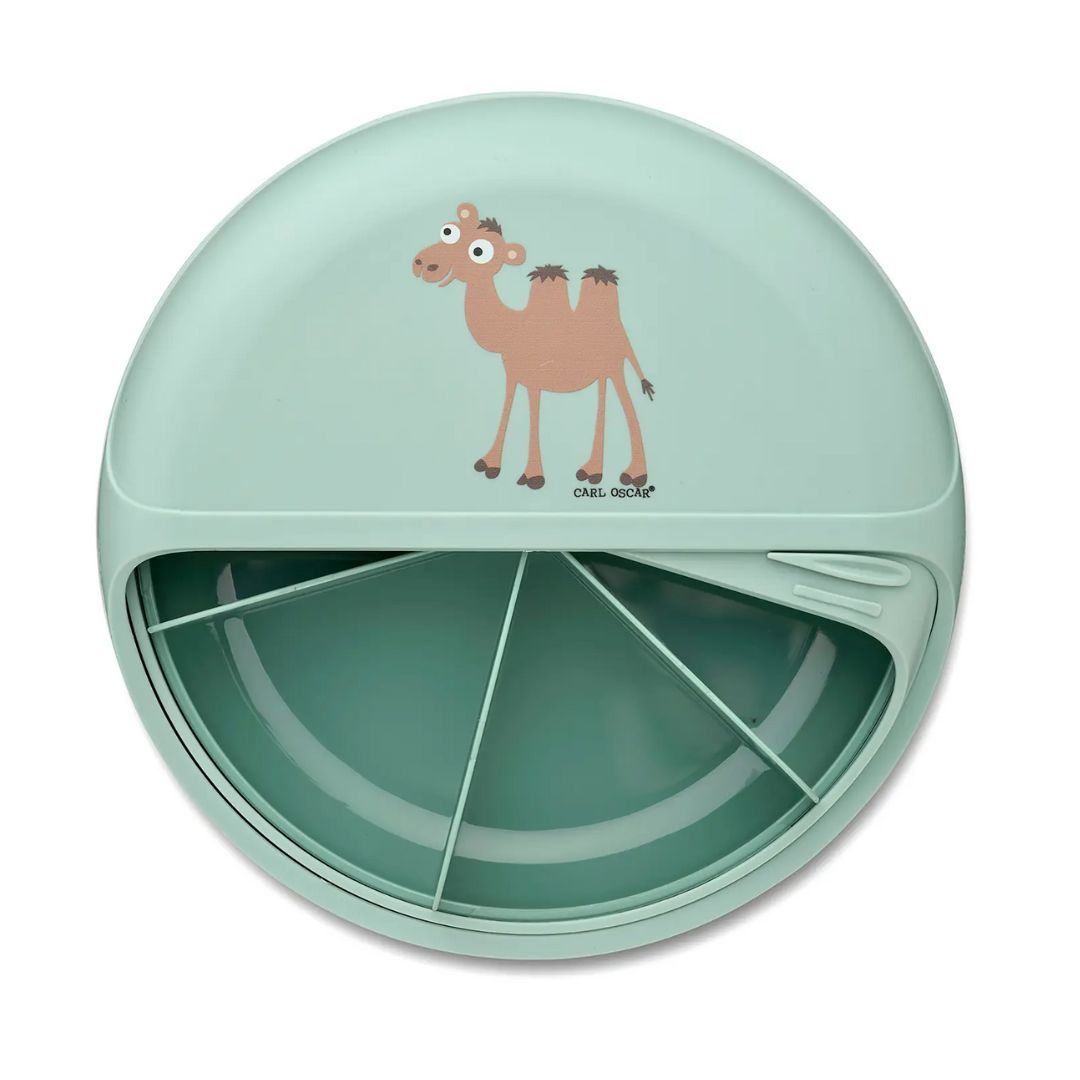 Das fröhliche Kamel-Design in Mint Grün macht die BentoDisc nicht nur funktional, sondern auch attraktiv für Kinder. Das ansprechende Aussehen sorgt dafür, dass dein Kind gerne auf seine Snacks zugreift. Mit der BentoDisc wird das Mittagessen zu einem spaßigen Event, bei dem die Kinder ihre Lebensmittel in einem einzigartigen und stilvollen Behälter genießen können. Egal ob in der Schulkantine oder beim Picknick im Park, diese Snackdisc zieht alle Blicke auf sich!