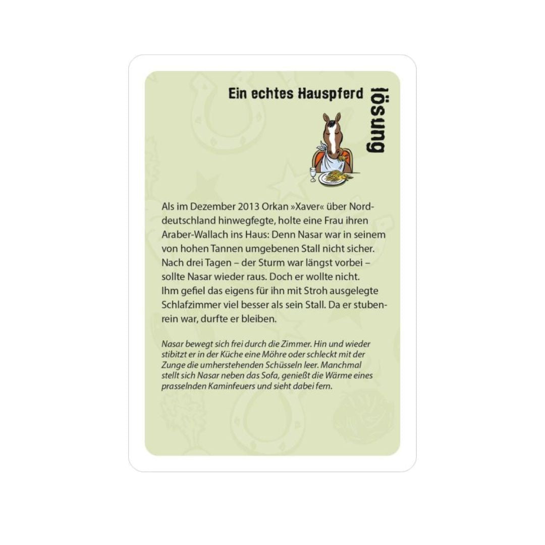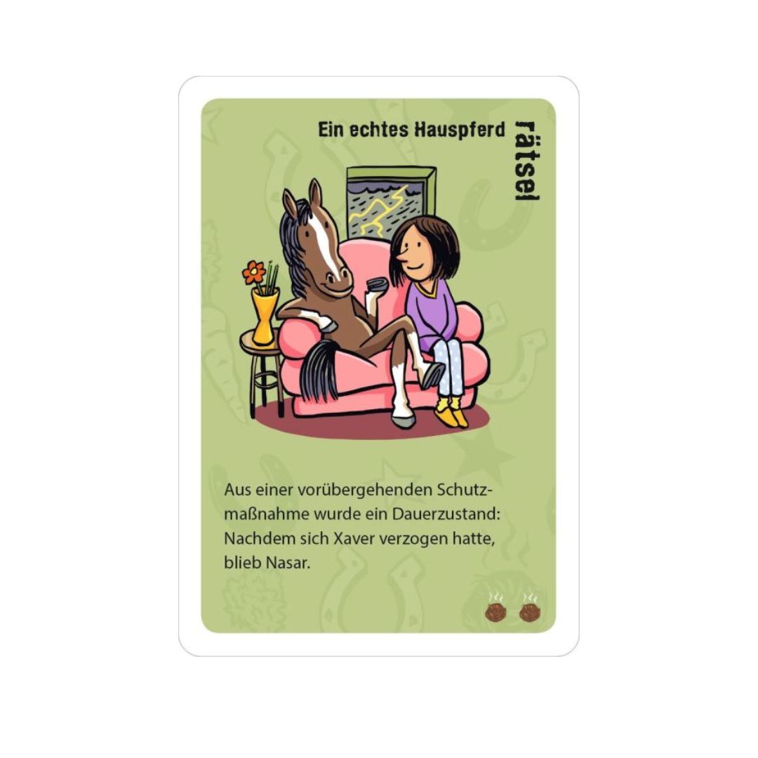 Illustrationen: Jede der 50 Karten ist durchgehend vierfarbig illustriert und zieht die Spieler*innen in die spannende Pferdewelt hinein. Die Illustrationen von Helmut Kollars verleihen den Geschichten eine lebendige und einladende Atmosphäre.