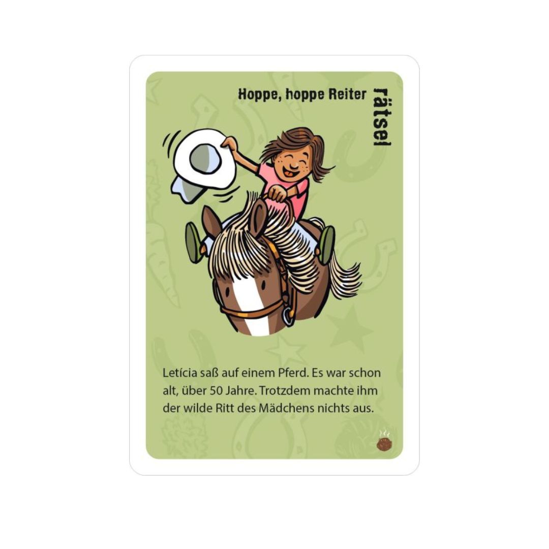 "black stories junior" sind keine gewöhnlichen Rätselgeschichten. Sie sind speziell für junge Entdecker*innen ab 8 Jahren konzipiert und laden dazu ein, in die Welt der Pferde, Geheimnisse und Abenteuer einzutauchen. Die Geschichten sind kurz, spannend und mit einem Hauch von Mystery gespickt. Du wirst über geisterhafte Pferde stolpern, auf explodierende Misthaufen treffen und in aufregende Situationen geraten, die nur darauf warten, von dir entschlüsselt zu werden.