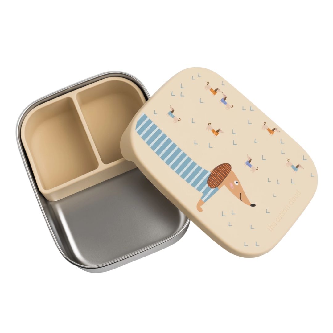 Mit ihren drei Fächern bietet die Lunchbox eine praktische Lösung zur getrennten Aufbewahrung von Lebensmitteln. Ob Obst, Gemüse oder Hauptmahlzeiten – alles bleibt frisch und getrennt voneinander. Das ikonische Muster der süße Dackel verleiht der Box zudem eine spielerische Note, die besonders bei Kindern gut ankommt.