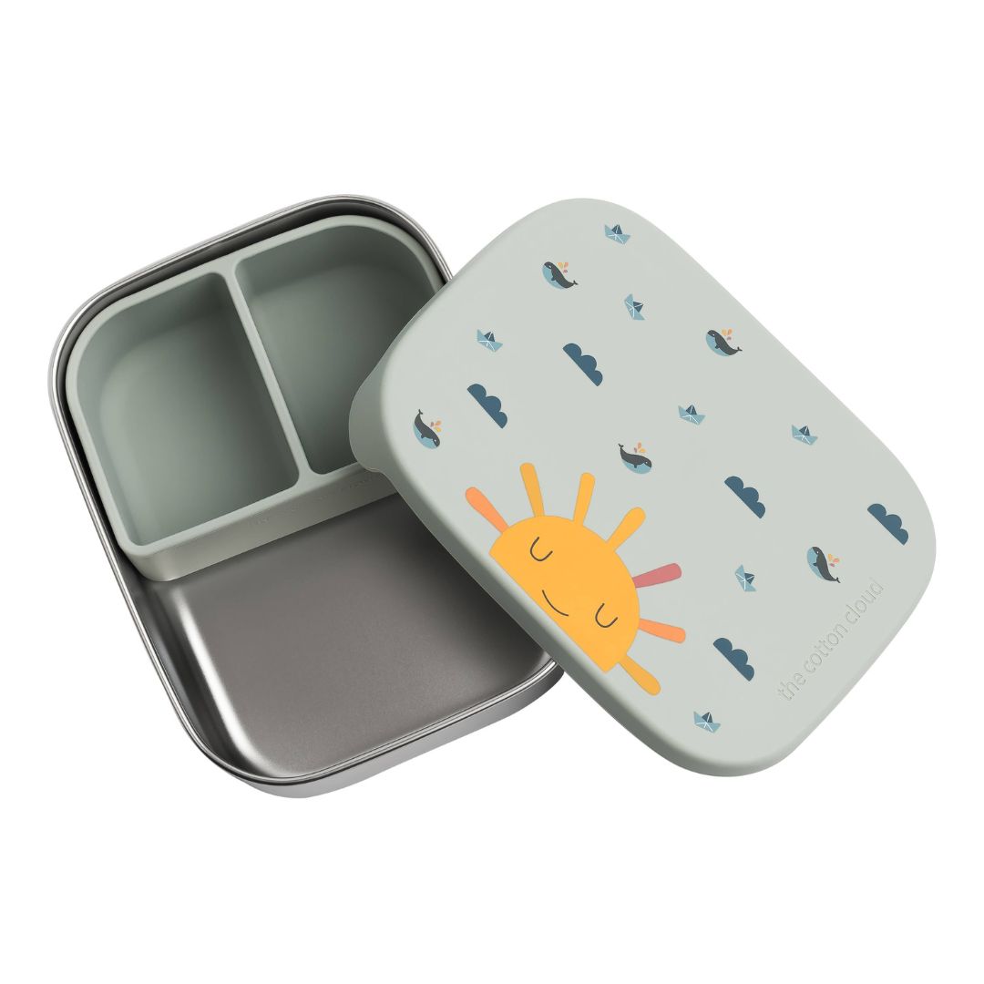 Lunchbox aus Edelstahl mit ikonischem Muster 'Origami' Sonne und kleine Wale
