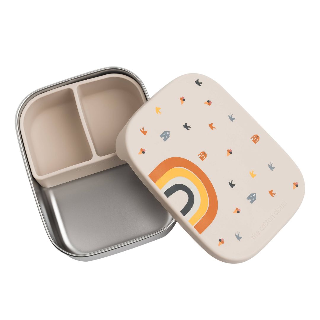 Lunchbox aus Edelstahl mit Silikondeckel und witzigem Motiv: 'Regenbogen'