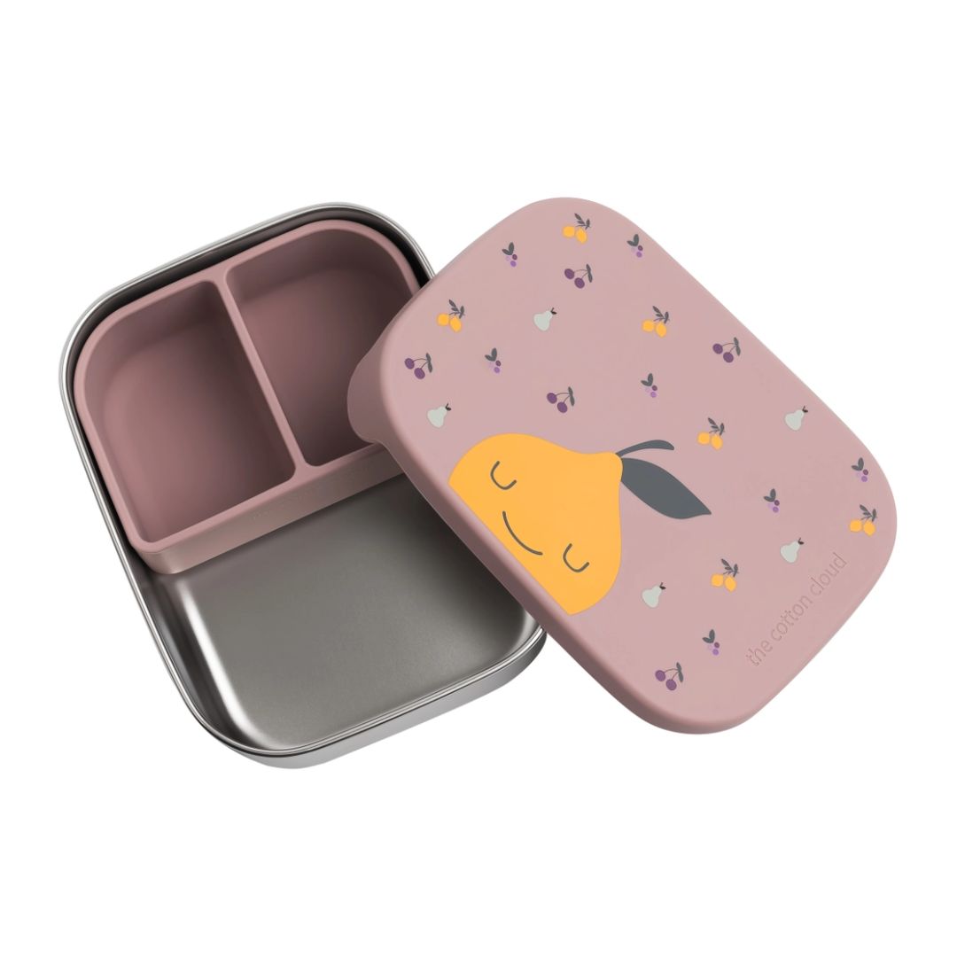 Lunchbox aus Edelstahl mit Silikondeckel und witzigem Motiv: 'Fruity'
