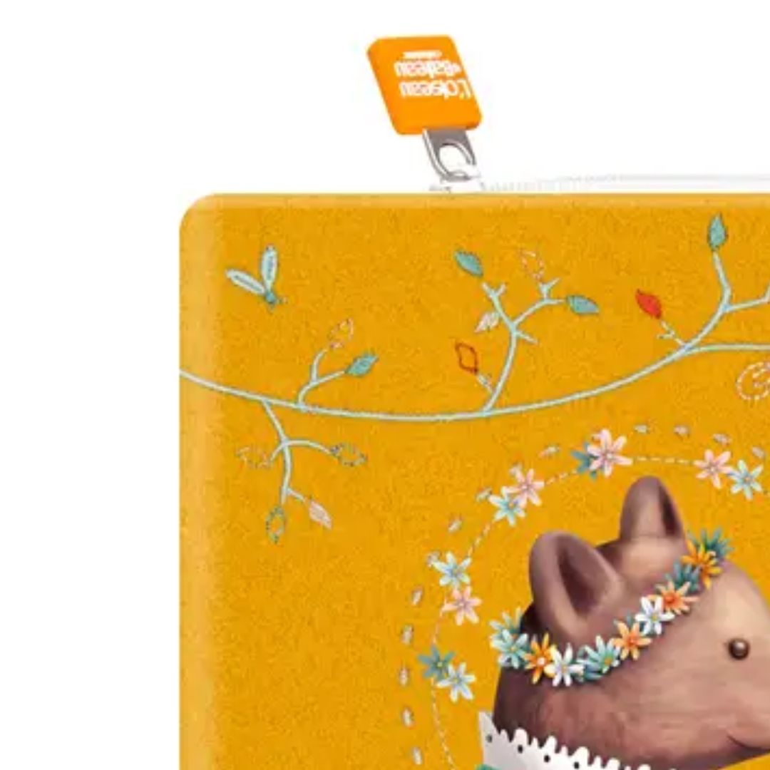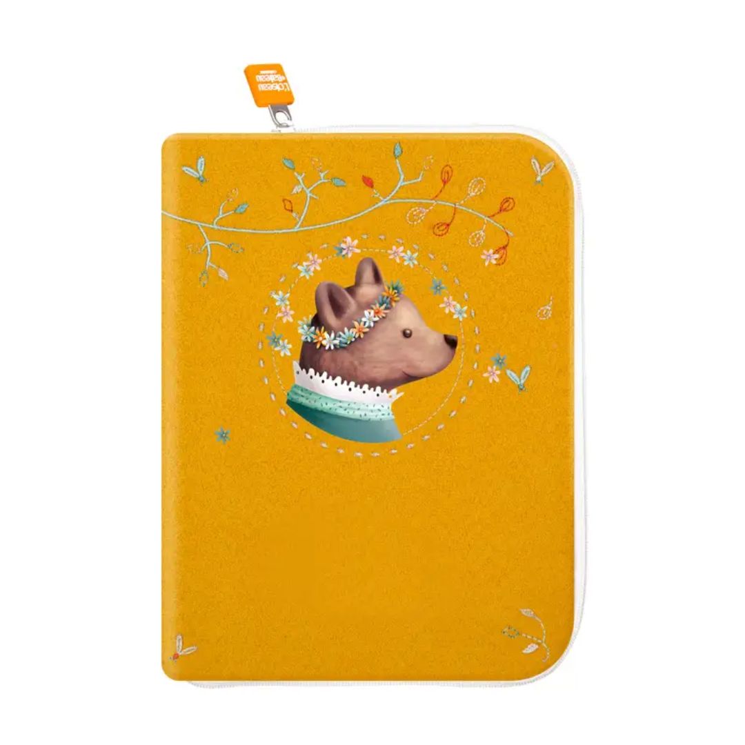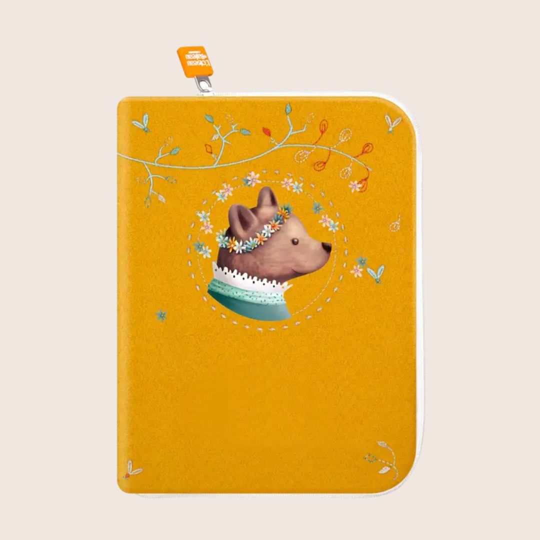 Lass Dich von dem bezaubernden senfgelben Bucheinband zur Babygesundheit verzaubern - eine märchenhaft schöne Kreation mit dem kleinen Blumen-Bär aus weichem Veloursleder. Der Einband strahlt eine ganz besondere Eleganz aus.