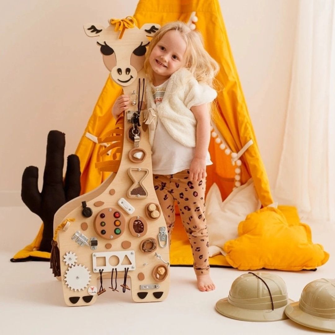 Dieses witzige Aktivitäts Spielzeug auch Busy Board genannt, ist das perfekte Spielgerät im Montessori Stil für stundenlanges interaktives und kreatives Spielen. Das Busy Board in Giraffenform gibt dem interaktiven Spielbrett eine Persönlichkeit und erobert das Herz Deines kleinen Süßlings aufgrund seines tollen Designs im Handumdrehen. Die vielen unterschiedlichen sensorischen Patches sind originell, interessant und kreativ. Mit viel Liebe zum kleinsten Detail wird diese süße Giraffe zum perfekten Spielbegleiter.