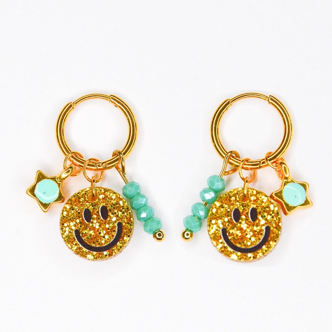 Die Ohrringe "Smileys Gold" sind ein echter Hingucker und das perfekte Accessoire für Kinder und Teens, die funkelnden Schmuck lieben. Diese kleinen, süßen Creolen aus hochwertigem, vergoldetem Edelstahl sorgen für einen verspielten, trendigen Look und bringen eine Extraportion Glanz in jeden Tag. Mit ihren glitzernden Smiley-Anhängern und den kleinen, zusätzlichen türkisfarbenen Charms setzen sie ein fröhliches Statement, das garantiert für gute Laune sorgt.