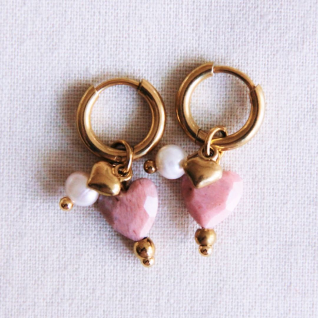 Damen Ohrringe Creolen mit Edelsteinherz, Miniherz und Perlen