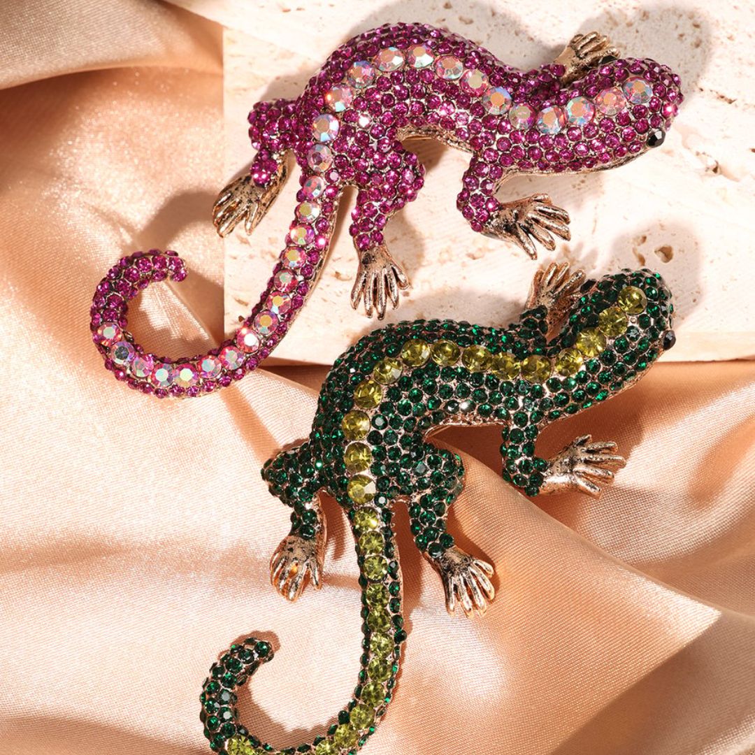 Die Strasssteine in facettenreichen Pinknuancen verleihen der Brosche ihren unverwechselbaren Charakter. Jeder einzelne Stein wurde präzise eingefasst und sorgt für ein glamouröses Funkeln, das je nach Lichteinfall lebendig schimmert. Das intensive Zusammenspiel der Pinktöne unterstreicht das kunstvolle Salamander-Motiv und verleiht ihm eine beinahe lebendige Ausstrahlung. Ob bei Tageslicht oder unter Abendbeleuchtung – dieses Schmuckstück entfaltet zu jeder Uhrzeit seine volle Magie.