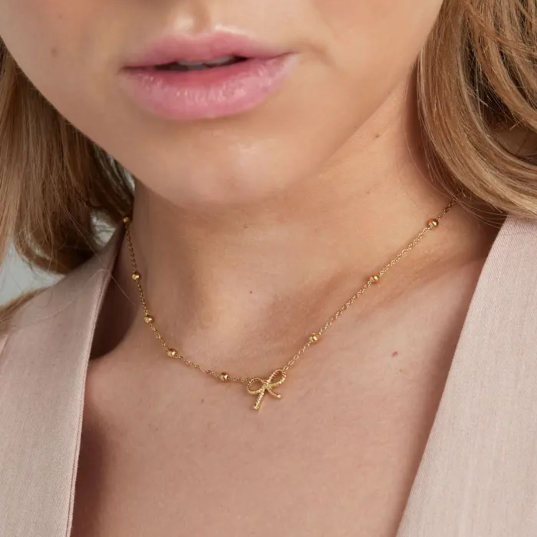 Eine Halskette ist mehr als nur ein Schmuckstück – sie ist ein Ausdruck deines persönlichen Stils und ein Highlight für jedes Outfit. Die Damen Halskette mit einer filigranen Schleife und kleinen Kugeln in Gold vereint dezentes Design mit hochwertiger Verarbeitung. Sie ist das perfekte Accessoire für Frauen, die Wert auf Eleganz, Stil und Qualität legen.