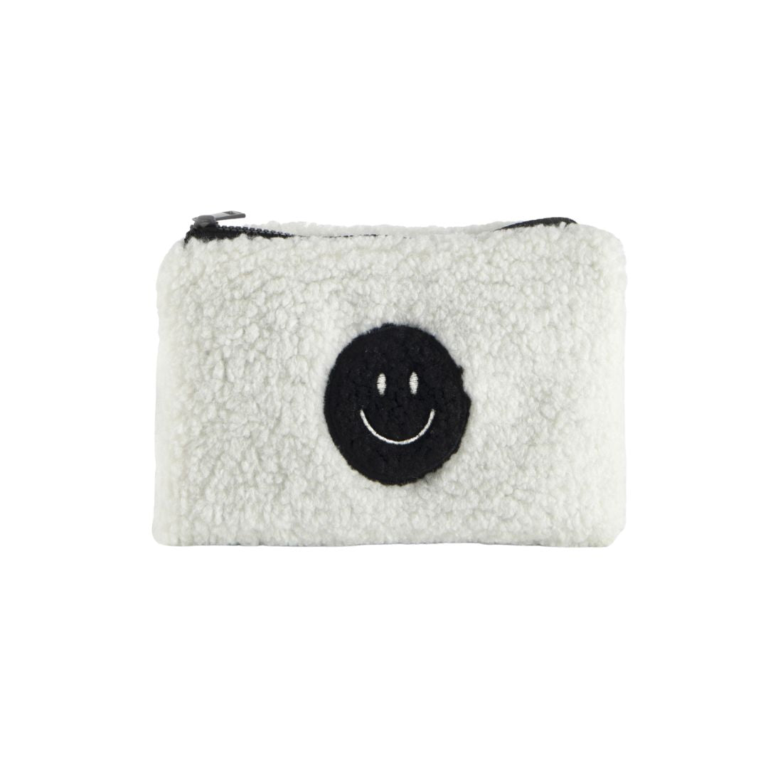 Damen Kosmetiktasche mit Teddyfell und Smiley weiß