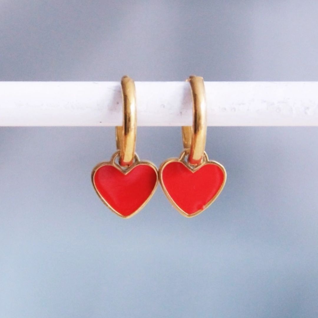 Damen Ohrringe Creolen mit roten Herzanhängern gold