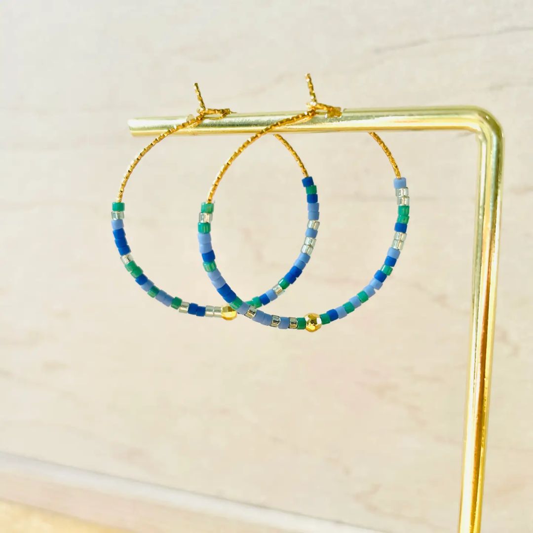 In den Creolen wechseln sich zarte Türkistöne mit kräftigeren Blauakzenten ab. Die Perlen reflektieren das Licht, ohne zu glitzern – sie wirken edel, dezent und hochwertig. Zwischen den Farbtönen sorgen kleine goldene Edelstahlperlen für Struktur und bringen einen warmen Kontrast ins Spiel. Das Ergebnis: ein ausbalanciertes, stilvolles Schmuckstück, das auffällt, ohne aufdringlich zu sein.