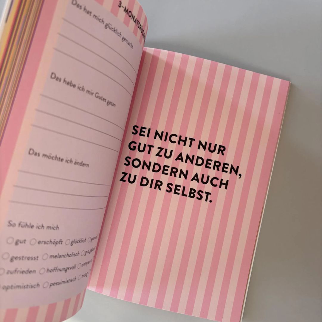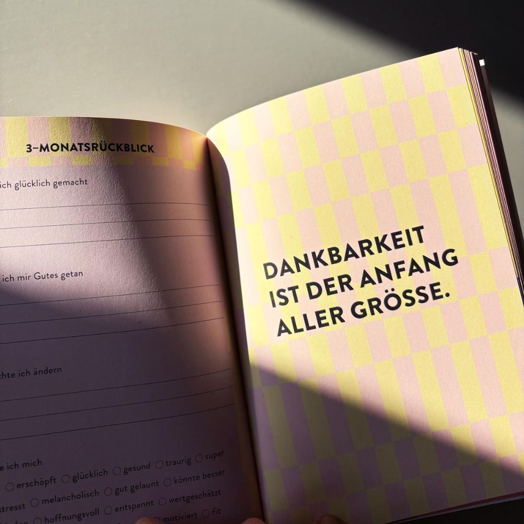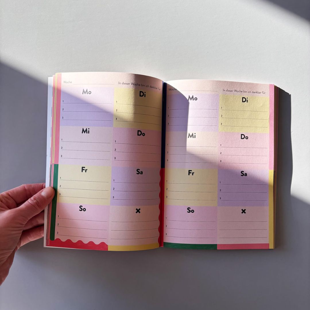 Mit seinen 52 Wochenseiten begleitet dich das Journal durch ein ganzes Jahr. Dabei sind die Tage bewusst nicht datiert, sodass du jederzeit starten kannst – ob mitten im Jahr oder nach einer kleinen Pause. Alle drei Monate findest du Reflexionsseiten, auf denen du deine Fortschritte und besonderen Momente der letzten Wochen noch einmal detaillierter festhalten kannst.