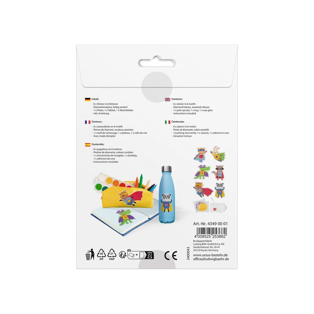 - 6 selbstklebende Sticker in verschiedenen Superhelden-Designs und Größen (ca. 6,3 - 7,3 cm). Jedes Design zeigt einen anderen kleinen Helden und bietet eine Vielzahl von Möglichkeiten, die Diamanten so zu platzieren, dass jeder Sticker einzigartig und beeindruckend aussieht.
