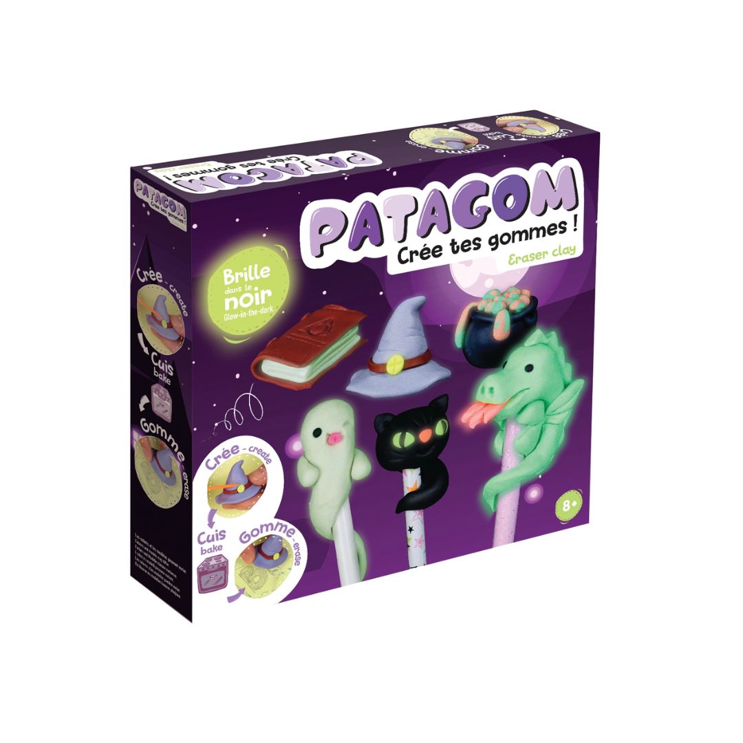 Patagom ist eine Modelliermasse zur Herstellung von Radiergummis. Die Farben sind miteinander mischbar. Forme deinen Teig in die gewünschte Form, bitte einen Erwachsenen, ihn 15 Minuten lang bei 120° C in den Ofen zu stellen, lasse ihn abkühlen. Dein Radiergummi ist fertig! Diese Hexereibox ist magisch, die Farben leuchten im Dunkeln! Alles wird bereitgestellt, um dein Zauberer-Universum zu erschaffen!