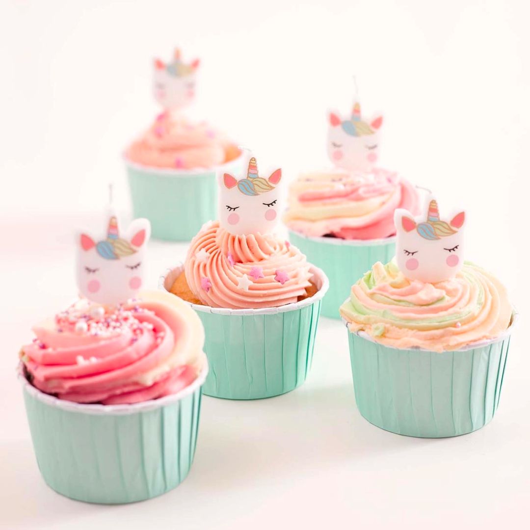 - Magische Cupcakes: Backe bunte Cupcakes und setze je eine Einhorn-Kerze als krönendes Highlight obendrauf.