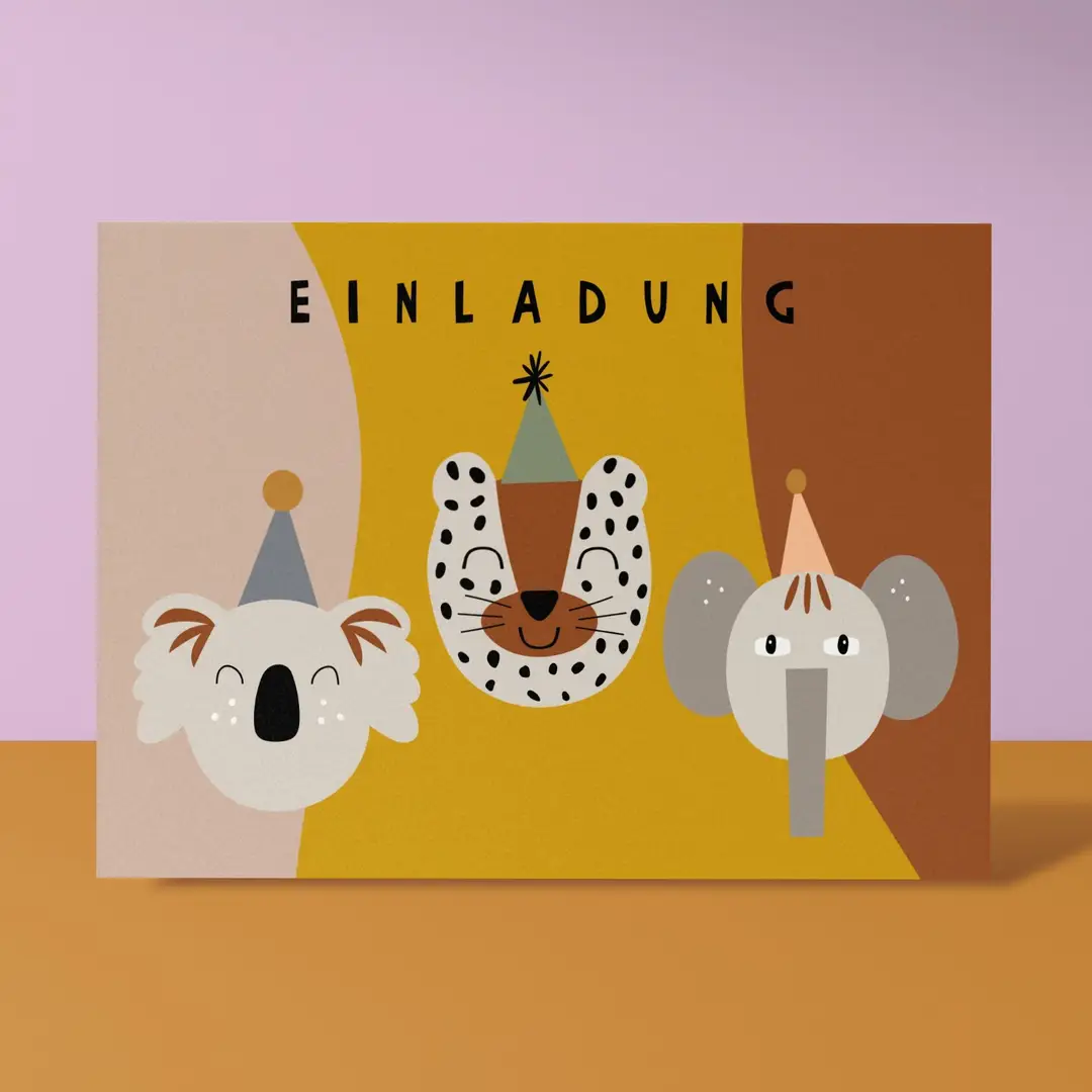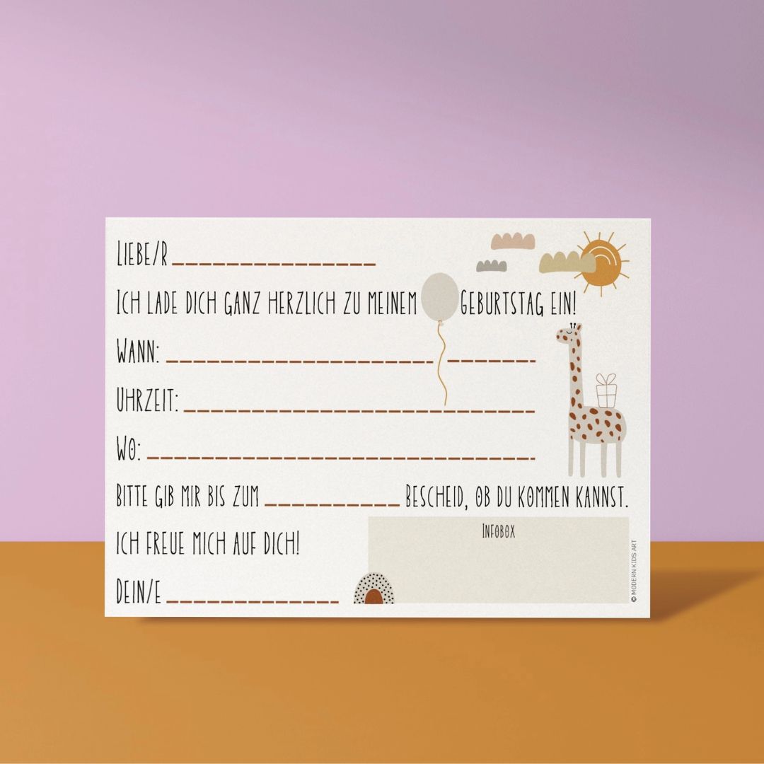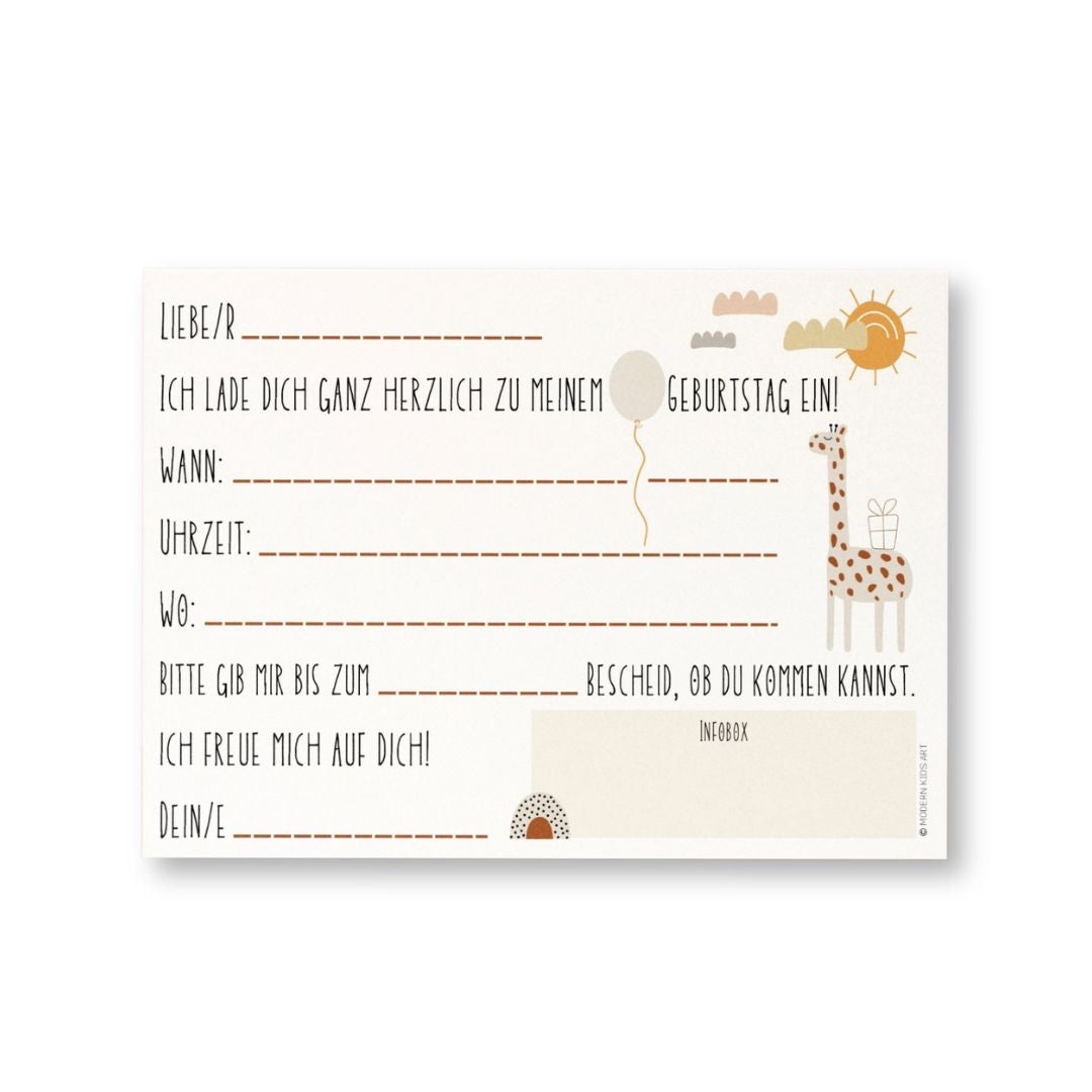 Einladungskarten zum Geburtstag mit coolen Safari Tieren. Die Rückseite ist bereits beschriftet und muss nur noch entsprechend ausgefüllt werden. DIN A6 auf hochwertigem und mattem 300 g/m² Naturpapier gedruckt, welches sich super beschriften lässt.