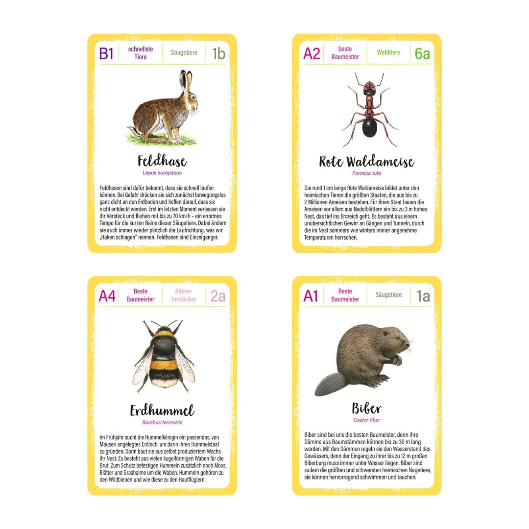 Dieses kompakte Quartett-Kartenspiel ist ein Klassiker, der nicht nur Spaß macht, sondern auch dein Wissen über die Tierwelt auf die Probe stellt. Die Freude an der Natur wird dabei spielerisch gefördert, während du interessante Fakten zu spannenden Tieren lernst, wie etwa dem blitzschnellen Wanderfalken oder dem faszinierenden Feuersalamander. Ganz nebenbei erfährst du alles über die unterschiedlichsten Tierarten – von den schnellsten bis zu den kräftigsten Baumeistern.