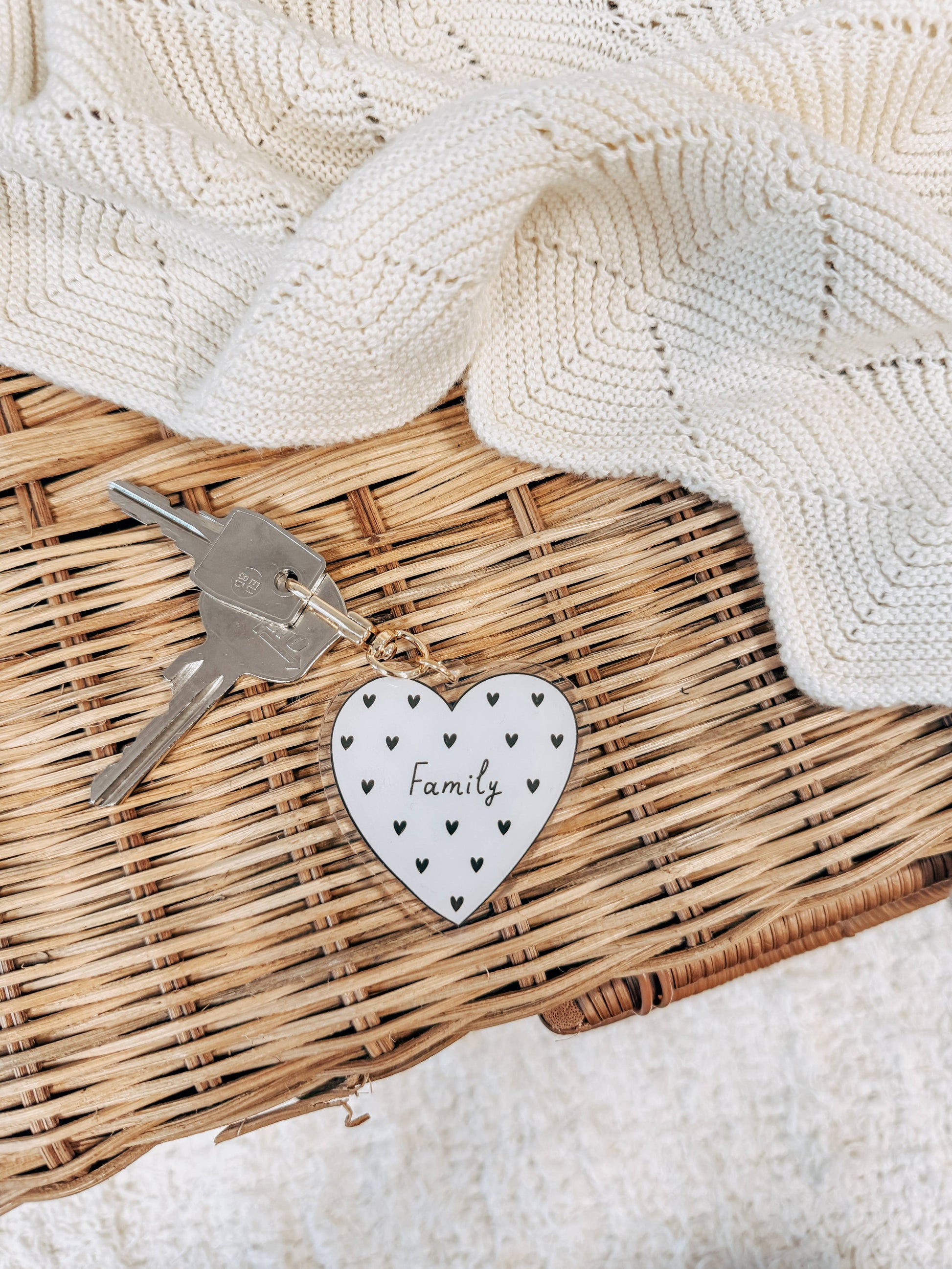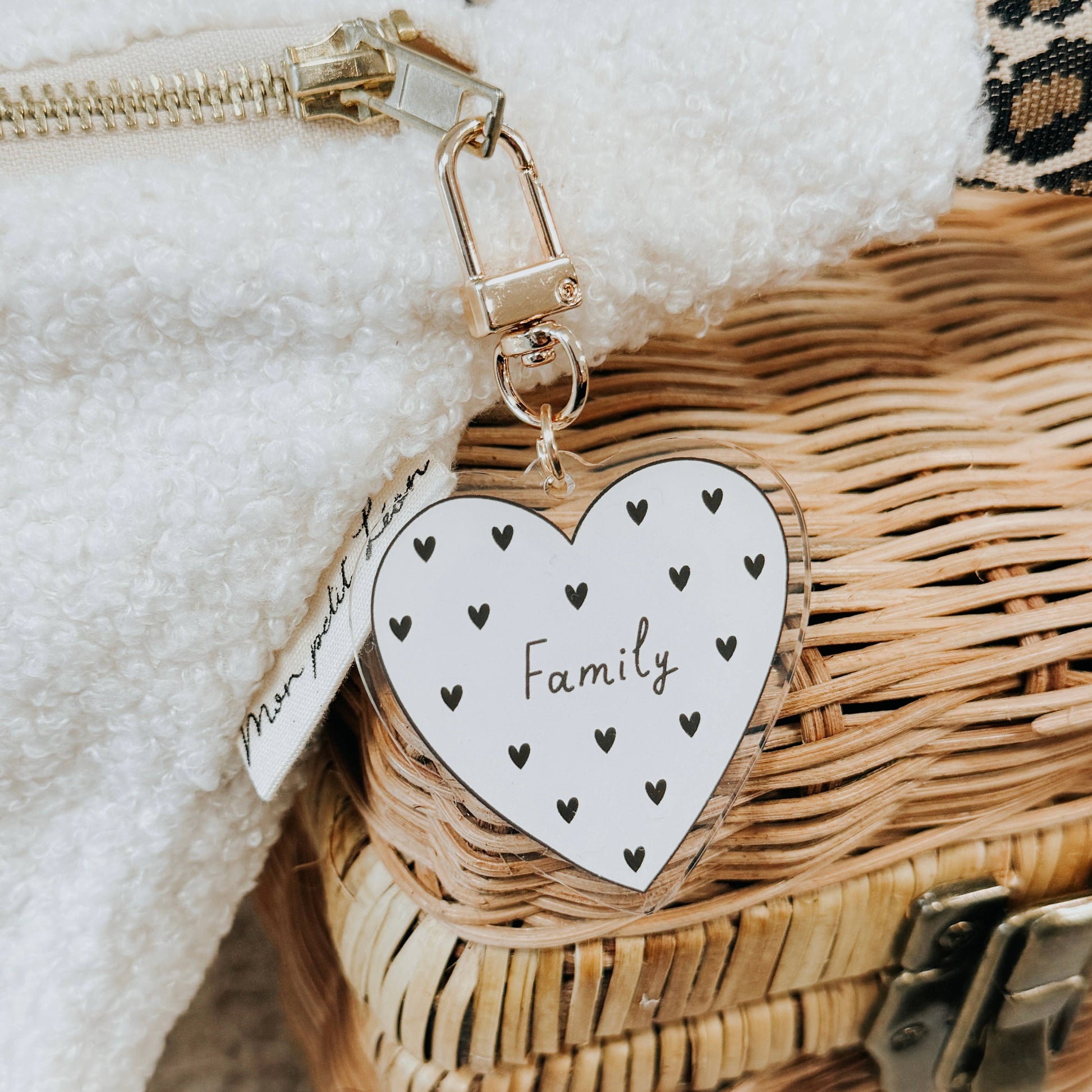 An seine Blutsfamilie, seine Herzensfamilie, an die Freunde, die zur Familie werden ♡ Dieses ikonische „Little Hearts“ -Muster ist jetzt als Schlüsselbund erhältlich! Mit Liebe gefüllter Schlüsselbund von außergewöhnlicher Qualität mit einer so starken Botschaft! Mit seinem Karabiner kannst du ihn als Schlüsselring verwenden, ihn aber auch einfach überall aufhängen (z. B. an deiner Banane, deiner Toilettentasche, deiner Reisetasche,...)