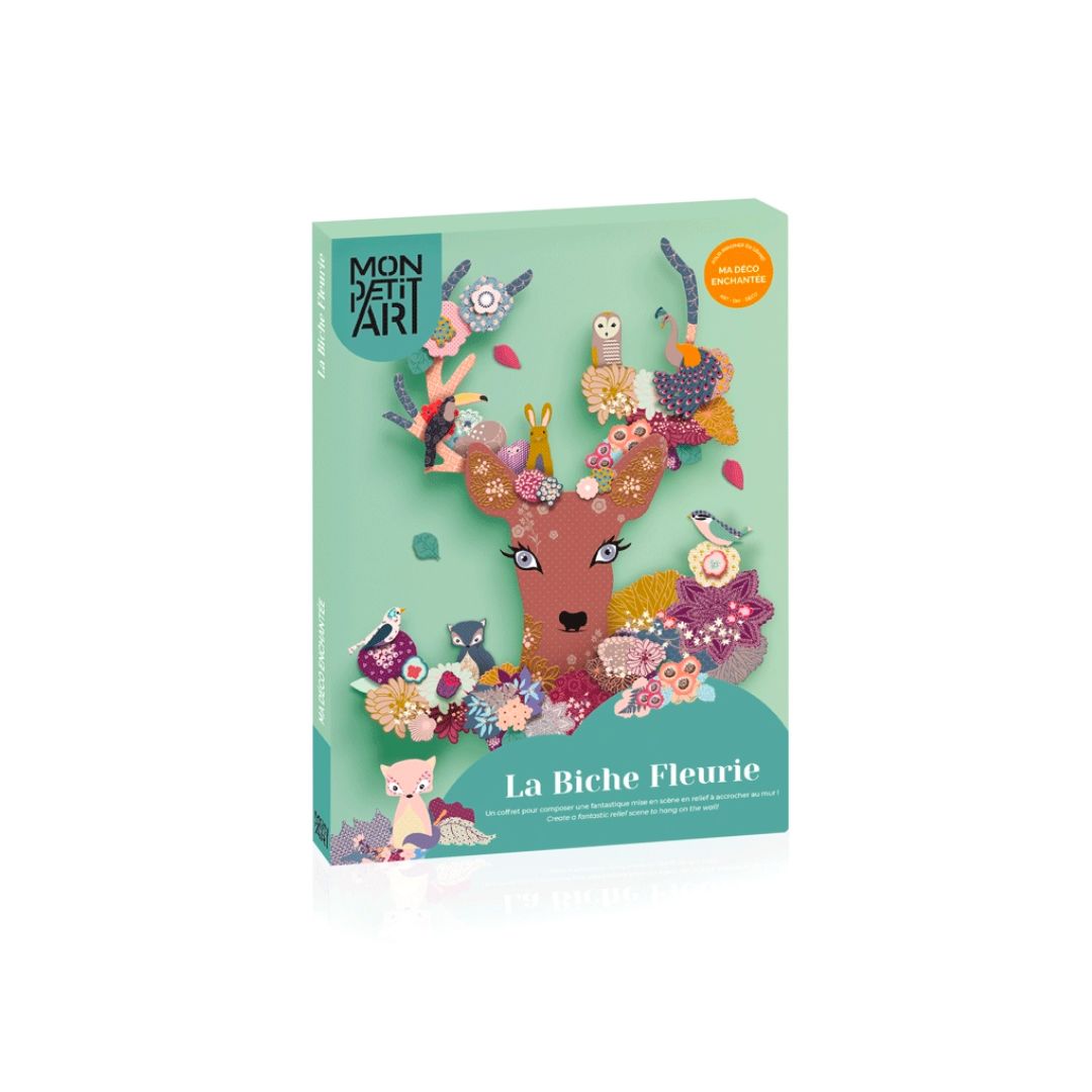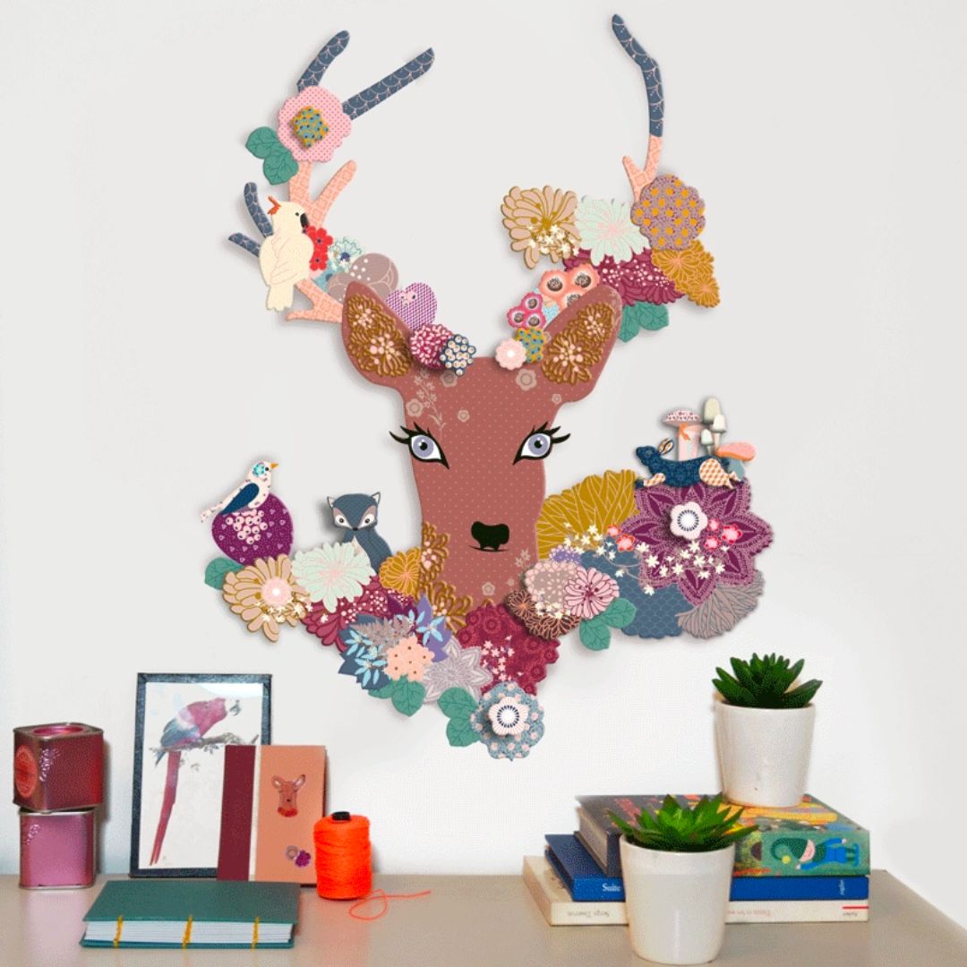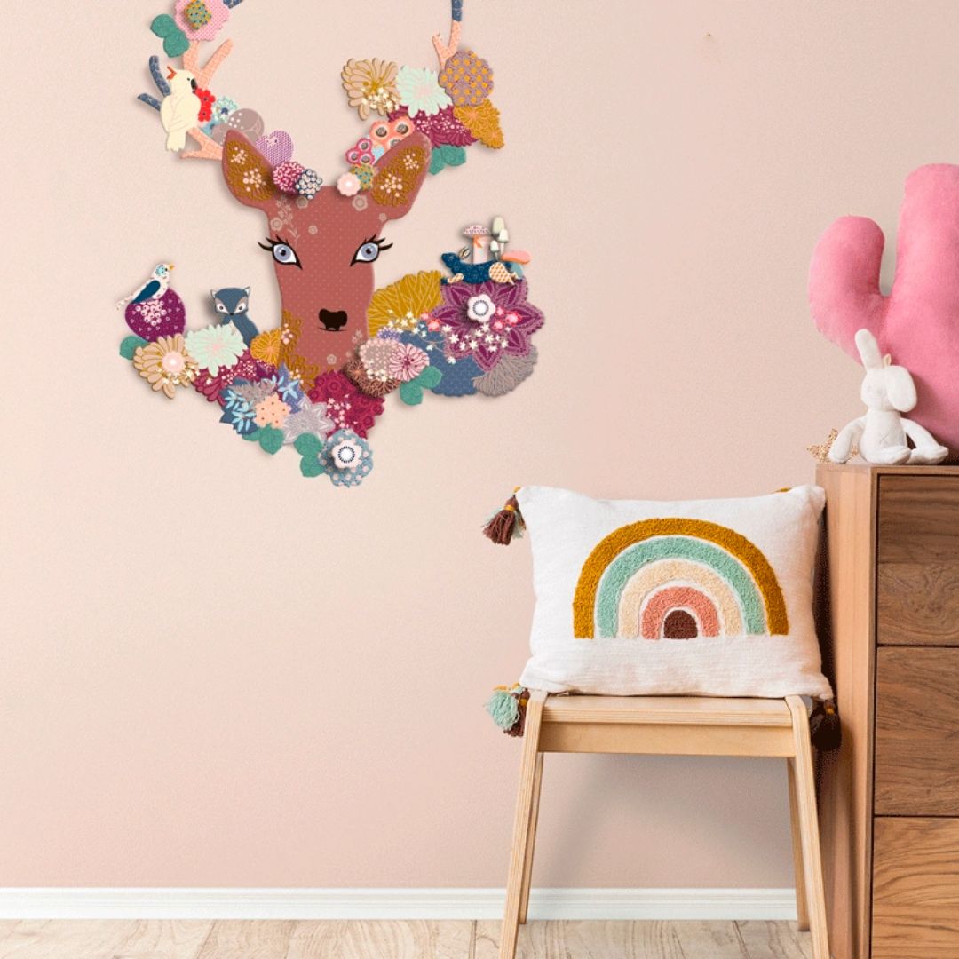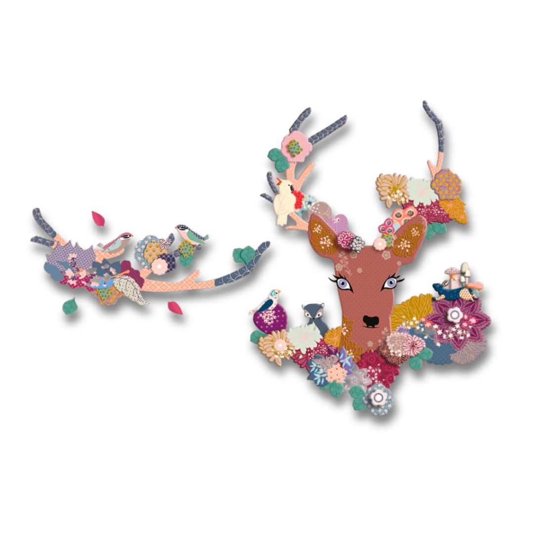 Stellt ein fantastisches Dekor für die Wand zusammen: ein fabelhaftes Reh, süße Schmetterlinge, neugierige Vögel, ein Waschbär... wie schön sind die Bewohner dieses Waldes! Eine kreative Dekoration, ideal um das Kinderzimmer zu verschönern.