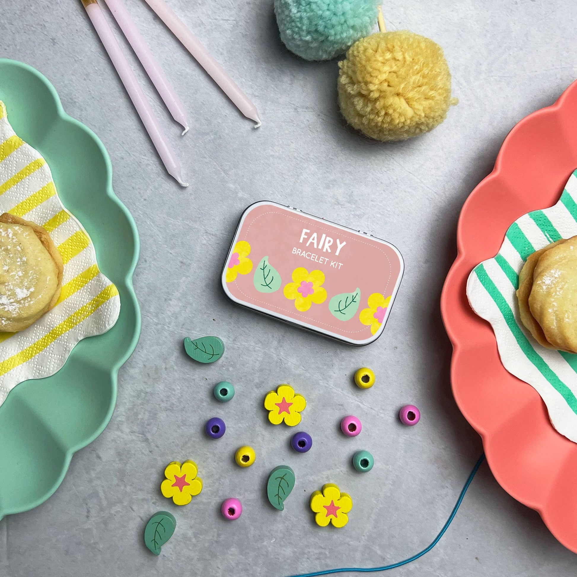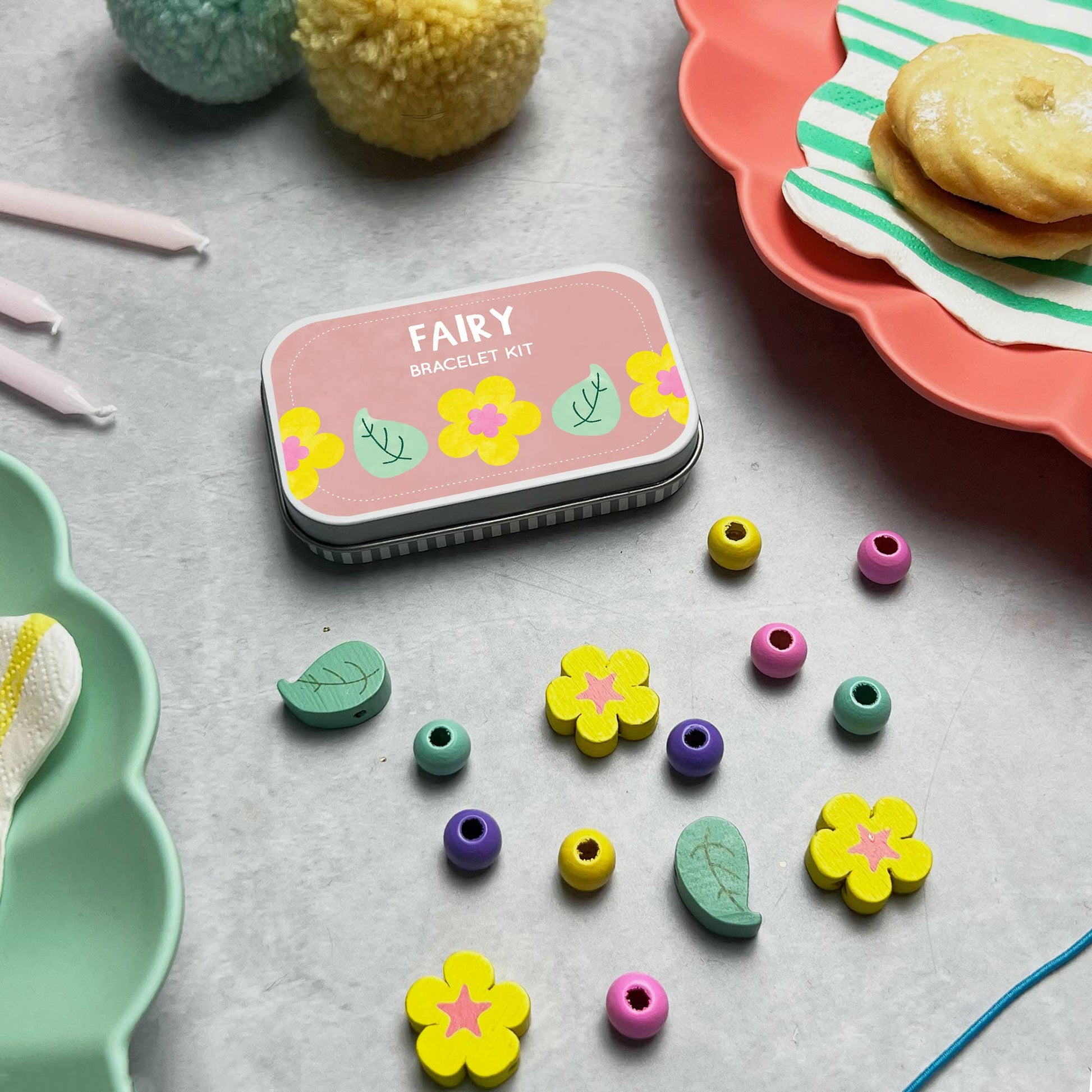 Eine wunderschöne Geschenkdose mit Gummiband und Perlen zur Herstellung eines floralen Feenarmbands. Kinder können ihr magisches Feenarmband aus den Blumen-, Blatt- und Kugelperlen zusammen mit dem mitgelieferten Gummiband zusammenstellen. Das Gummiband ist mit Metallenden ausgestattet, damit Kinder problemlos Perlen anbringen können. Die Dose kann zur Aufbewahrung des Armbands oder eines speziellen Schmuckstücks verwendet werden.