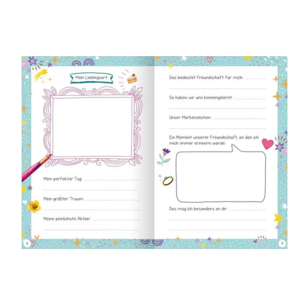 Im Mittelpunkt steht eure Freundschaft. Für jede Freundin und jeden Freund gibt es zwei liebevoll gestaltete Doppelseiten, auf denen sie sich kreativ austoben und ihre ganz persönliche Seite füllen können. Hier finden sich Fragen zu Lieblingsdingen, Hobbys, Träumen, besonderen Erlebnissen und natürlich zur Freundschaft mit dir. Die Seiten sind so gestaltet, dass sie sowohl Spaß machen als auch genügend Platz bieten, um sich richtig auszudrücken – mit Worten, Zeichnungen, Aufklebern oder kleinen Fotos.