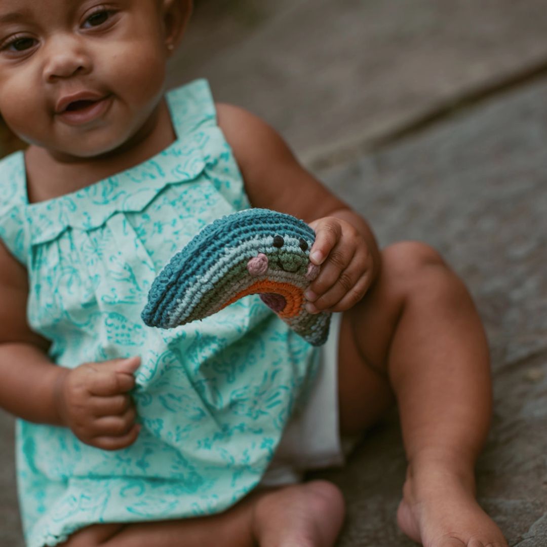 Wähle die Häkel-Babyrassel Regenbogen und bereite Deinem Baby einen fröhlichen Start ins Leben – ein Spielzeug, das mit Liebenswürdigkeit, Sicherheit und hoher Qualität überzeugt.