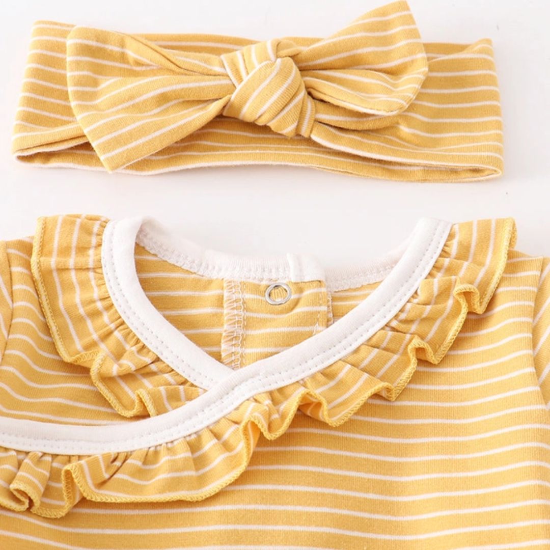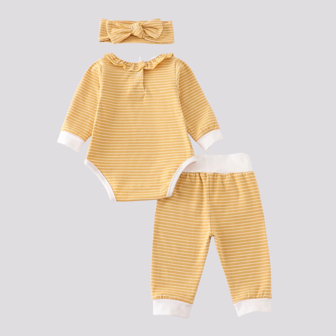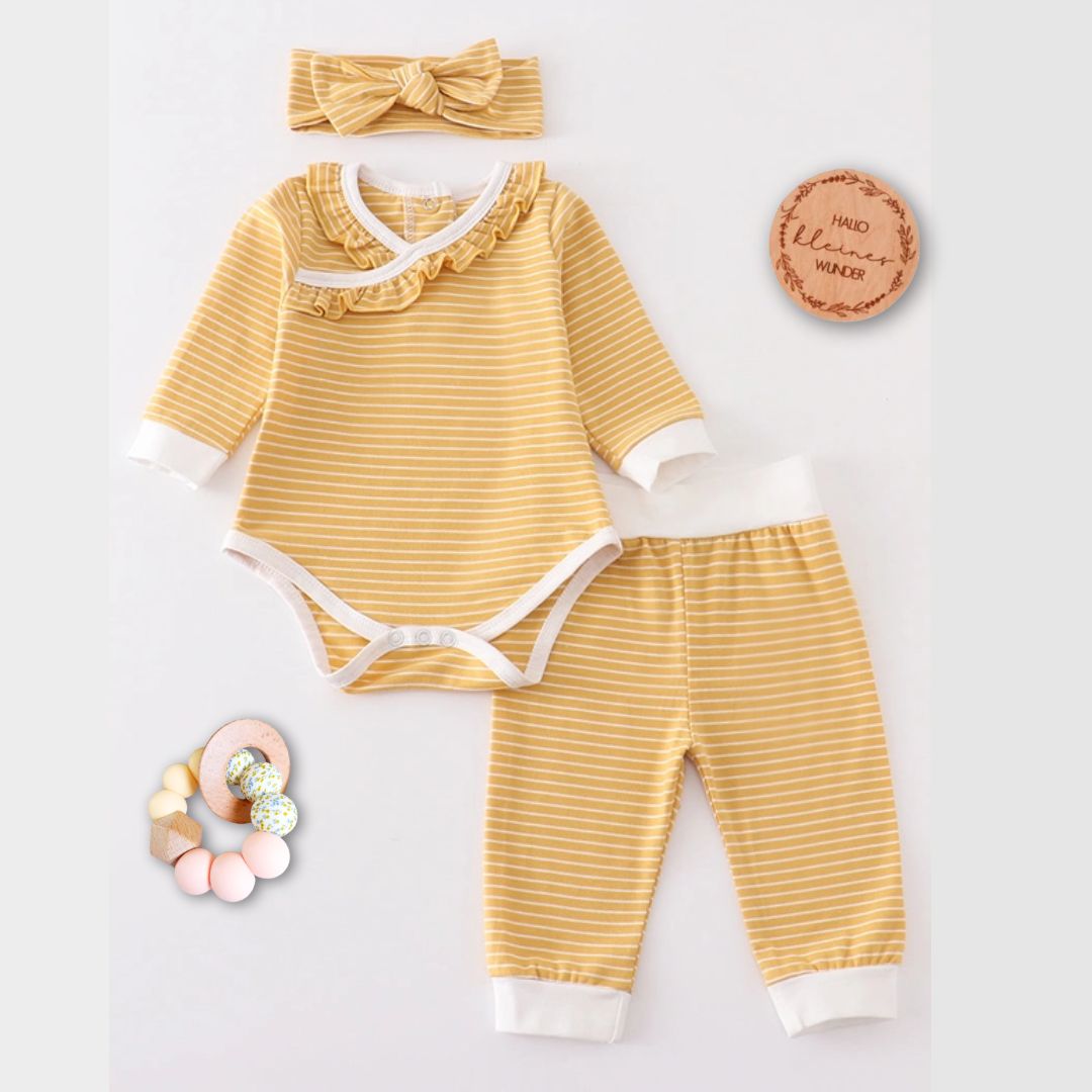 • 1 gestreifter Body Langarm gelb-weiß, passende Hose, passendes Kopfband, 1 Holzschild "Hallo kleines Wunder" und ein Baby Spielzeug aus Holz