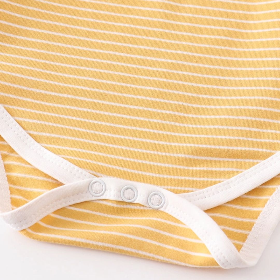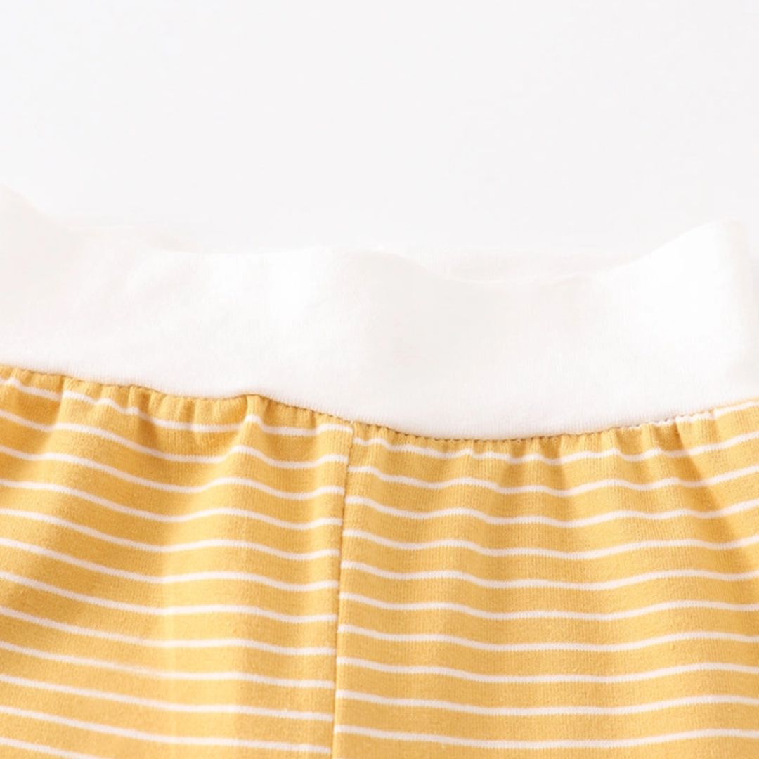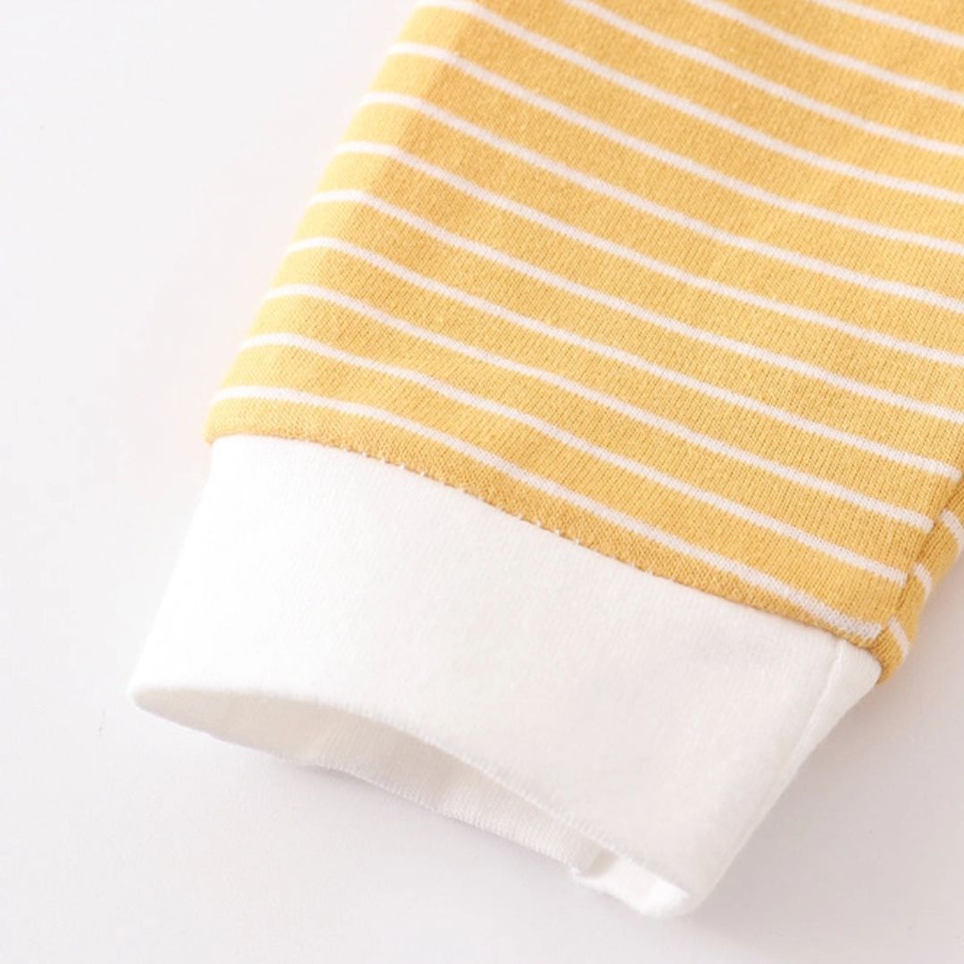 • 1 gestreifter Body Langarm gelb-weiß, passende Hose, passendes Kopfband, 1 Holzschild "Hallo kleines Wunder" und ein Baby Spielzeug aus Holz