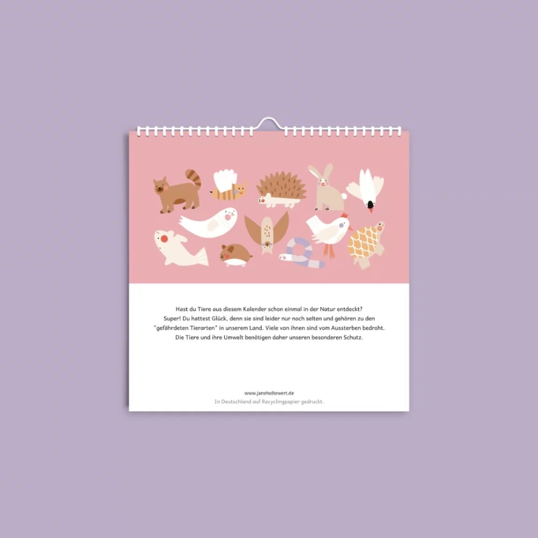 Doch dieser Kalender ist mehr als nur dekorativ. Er dient auch als pädagogisches Werkzeug, das die Achtsamkeit gegenüber bedrohten Tieren und ihrer Umwelt fördert. Jedes Tier wurde liebevoll illustriert und ist mit seinem Namen auf dem Kalenderblatt versehen. Zusätzlich enthält der Kalender auf der Rückseite kurze Beschreibungen zu den Tieren, die in Deutschland vom Aussterben bedroht sind.