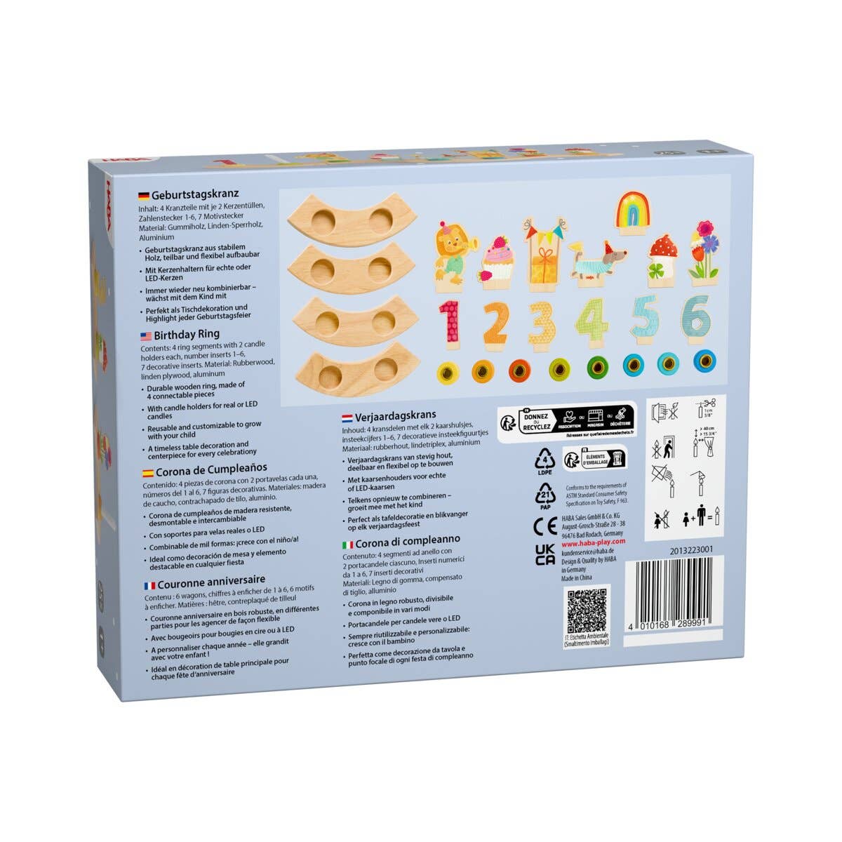 Dieser wunderschöne Geburtstagskranz aus Holz macht jede Feier zu etwas ganz Besonderem. Die 4 Holzelemente lassen sich flexibel zusammensetzen und mit Kerzen sowie bunten Steckfiguren schmücken. Ob Zahlen, Tiere, Regenbogen, Blumen oder süße Leckereien – der Kranz kann jedes Jahr neu gestaltet werden und wächst so mit dem Kind mit. So wird jeder Ehrentag zu einem unvergesslichen Erlebnis für kleine und große Geburtstagskinder. Altersgruppe: 12+ Monate
