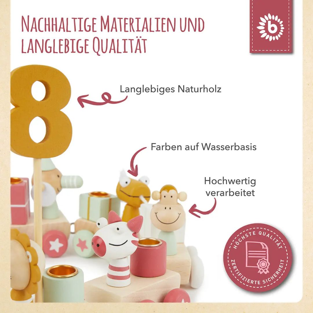 Der Geburtstagszug Holz Berry 0–99 Jahre überzeugt durch seine erstklassige Qualität. Gefertigt aus hochwertigem Holz, ist er besonders langlebig und stabil. Die präzise Verarbeitung sorgt dafür, dass du lange Freude an deinem Geburtstagszug hast und er über viele Jahre hinweg immer wieder zum Einsatz kommen kann. Die sorgfältig gearbeiteten Details machen ihn zu einem besonderen Stück, das du immer wieder gerne hervorholen wirst.